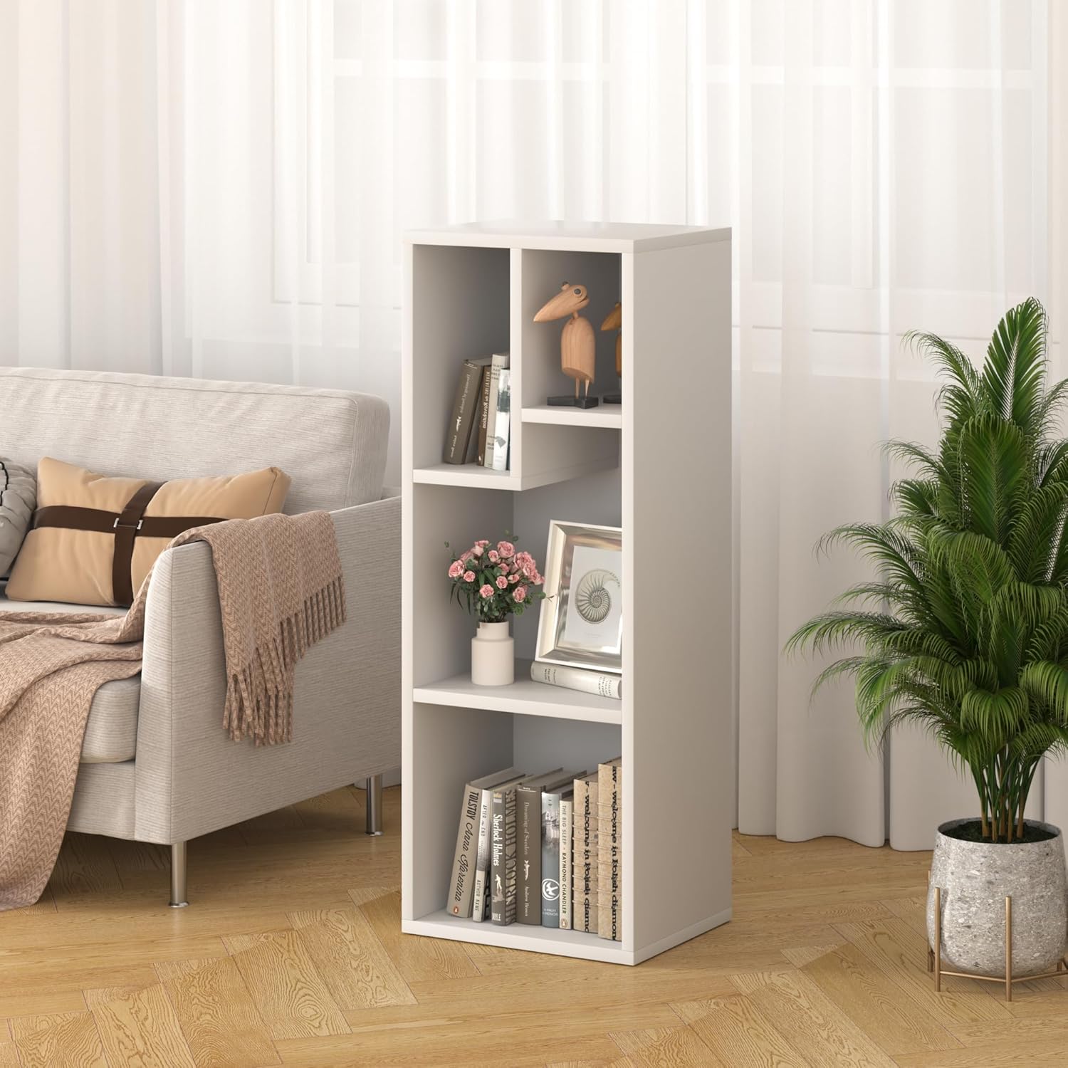 VECELO Small White Bookshelf, 4 Cube Slim Bookcase, Fits Tallest Hardcovers, Horizontal Available, Modern Floor Standing Unit, Each Shelf Hold Up to 66 LBS, Pearl White
