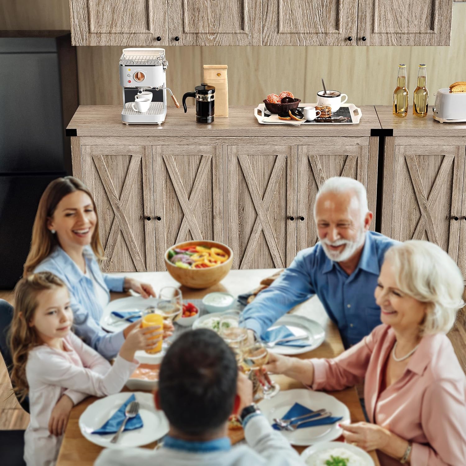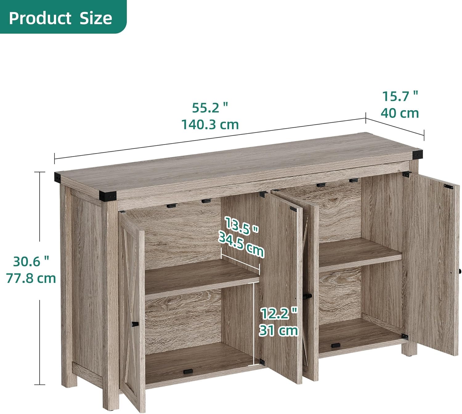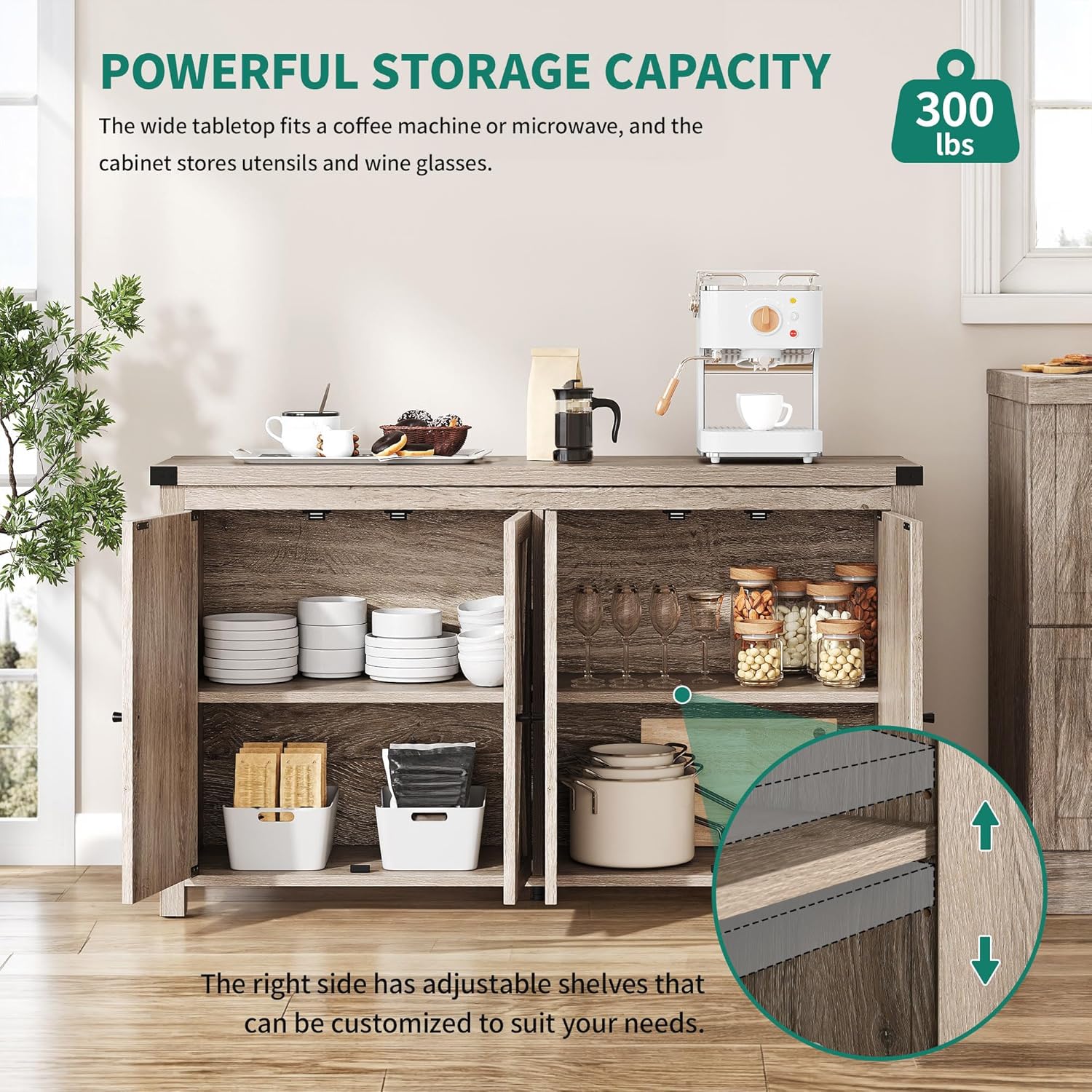 YITAHOME Buffet Cabinet with Storage, 55'' Modern Farmhouse Coffee Bar Cabinet w/4 Doors &Adjustable Shelf, Wood Large Kitchen Storage Cabinet with Barn Doors for Kitchen, Living Room, Grey-Brown