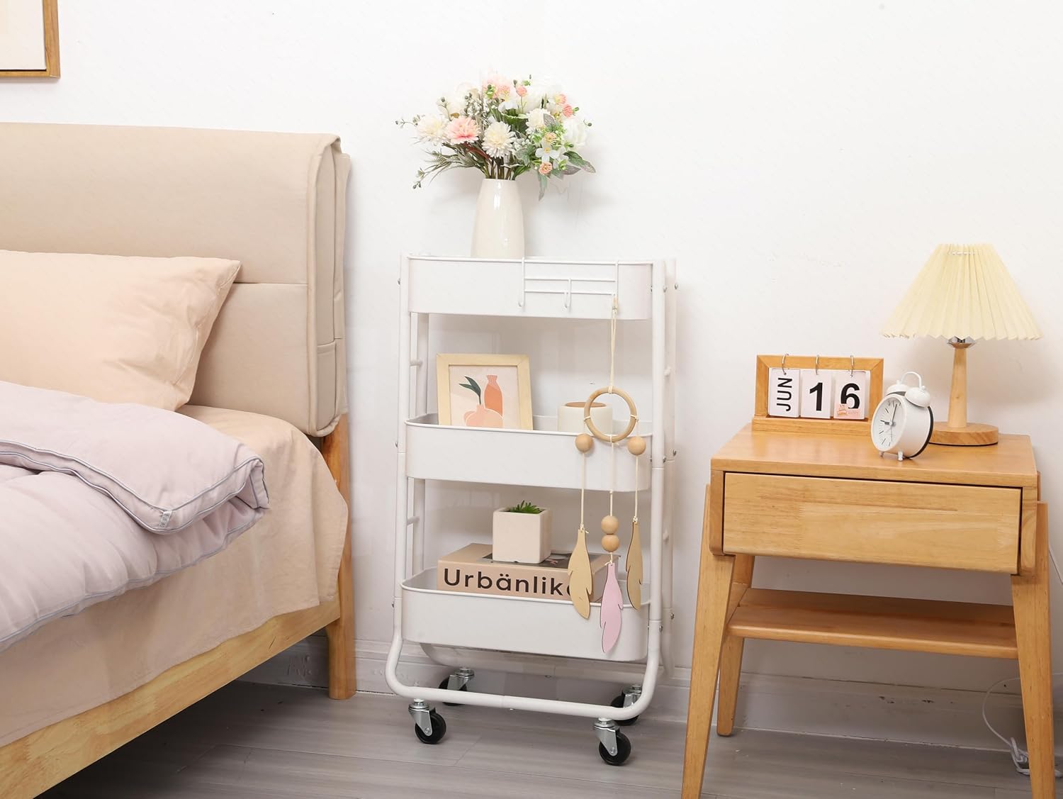 MAX Houser Slim 3-Tier Rolling Utility Cart, Narrow Metal Bathroom Storage Multifunctional Organizer Carts with Wheels with Extra Hook, Laundry Room,Kitchen,Small Space(White)