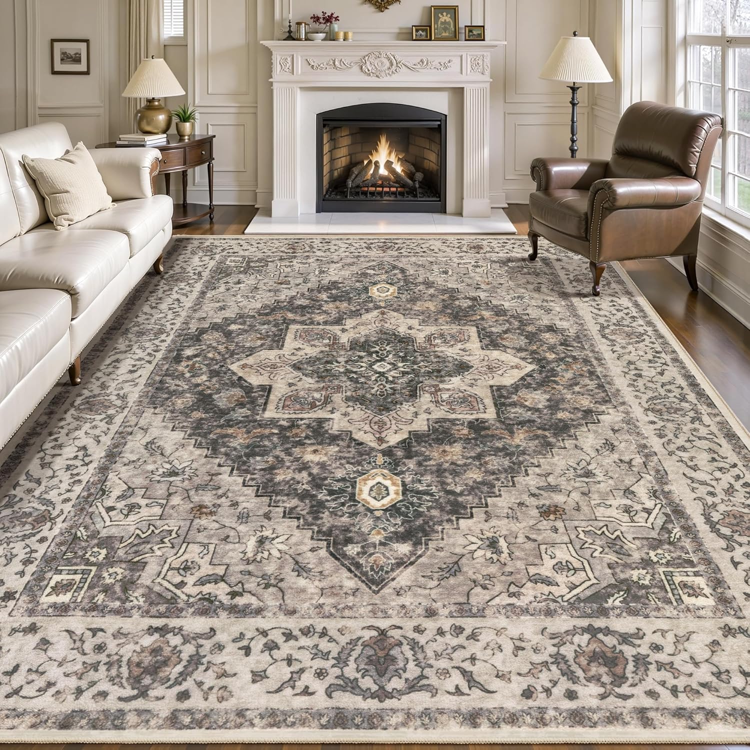 Tangsoo 8x10 Area Rugs for Living Room, 8x10 Washable Rug Vintage Indoor Non Slip Large Area Rugs, Print Distressed Brown/Grey Carpet, Soft Low Pile Foldable Floor for Bedroom Dining Room Dorm