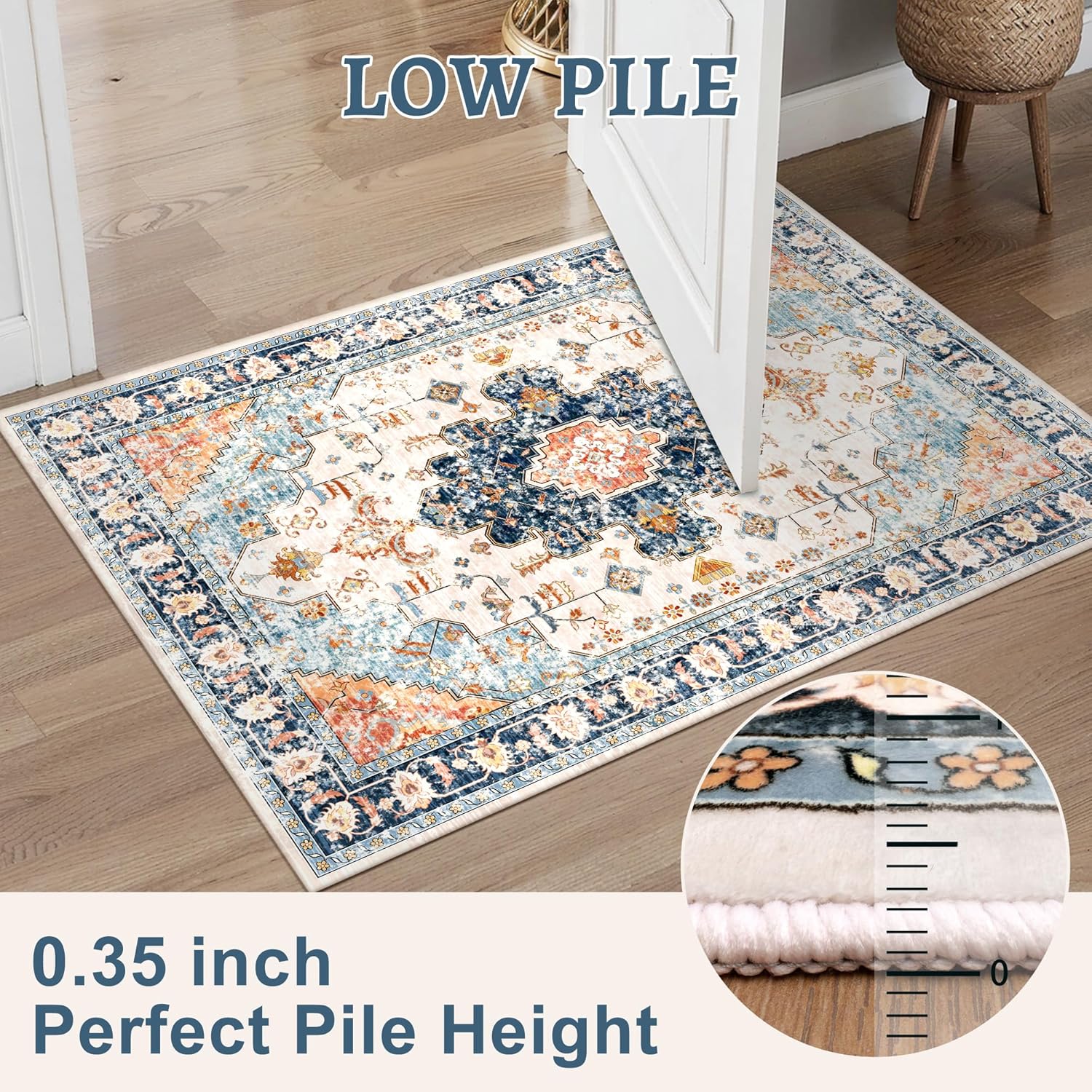 Tangsoo 2x5 Washable Runner Rug for Hallways, Non Slip Vintage Runner Rug, Soft Low Pile Long Print Distressed Blue/Orange for Kitchen Bedroom Entryway Bathroom Living Room