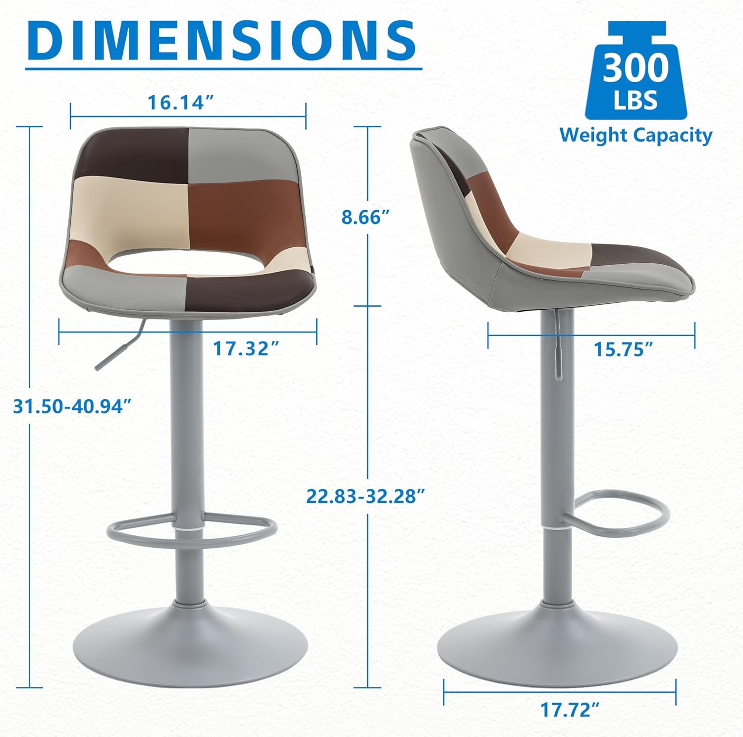 YOUNIKE Bar Stools Set of 2, Boho Colorful Patchwork Faux Leather Barstools, Adjustable Swivel Counter Height Bar Stool Upholstered Counter Stools with Hollow Back for Kitchen Island, GreyBeige