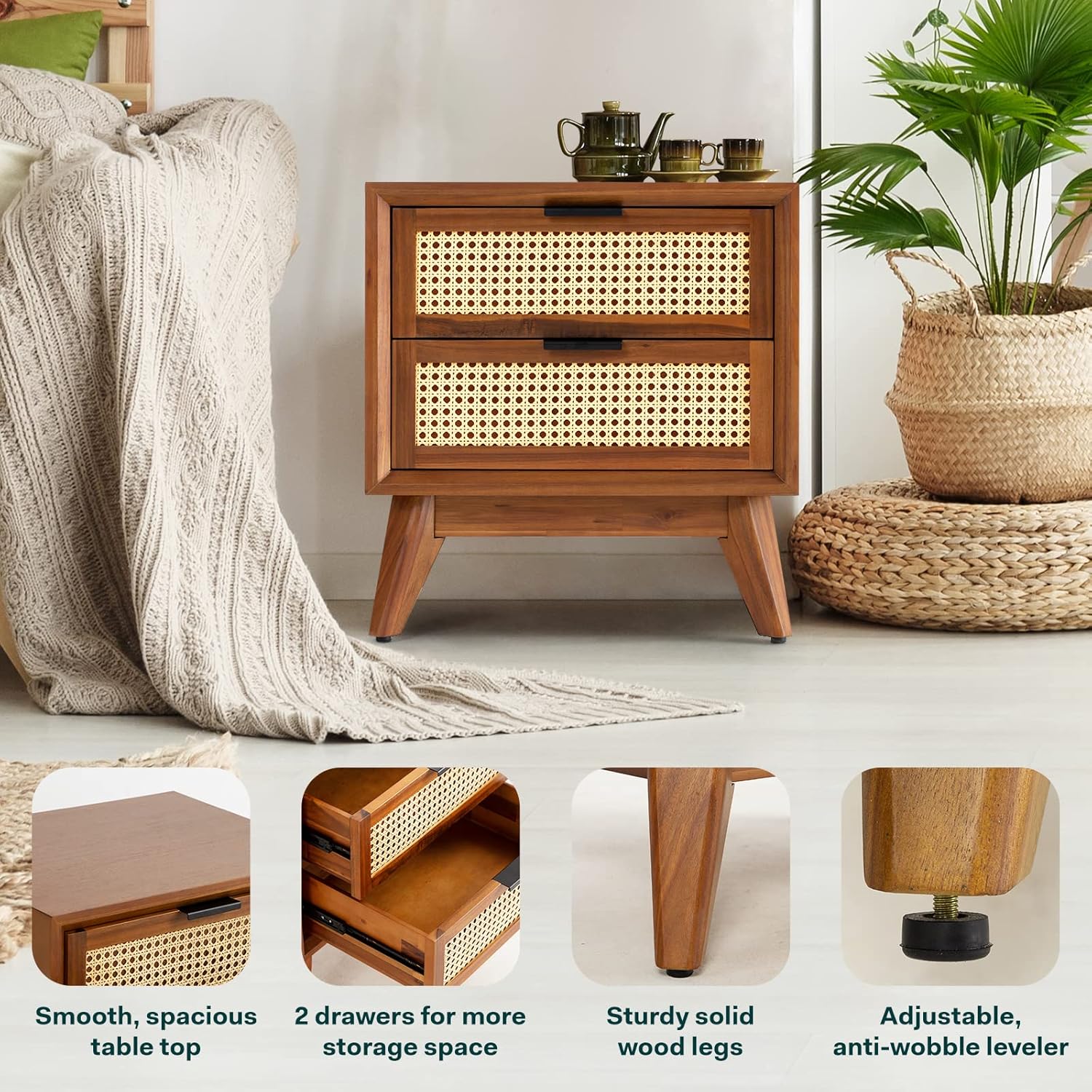 - QUALITY RATTAN NIGHTSTAND: The solid wood nightstand offers a durable acacia laminated surface; More stability is provided by the solid acacia wood legs with adjustable levelers. You can buy rattan nightstand set of 2 to replace a dresser in the bedroom