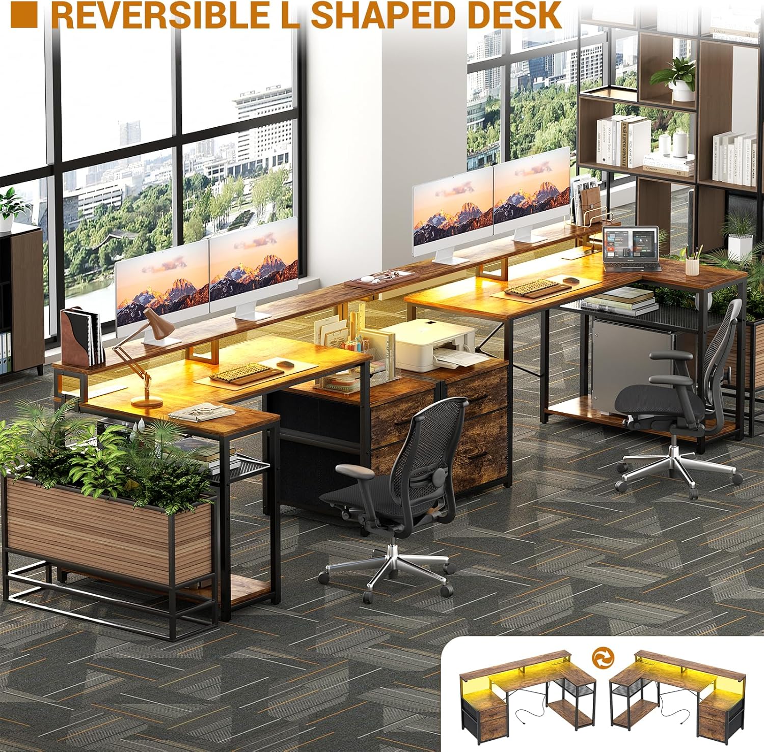 Aheaplus L Shaped Desk with File Drawer, Reversible L Shaped Computer Desk Gaming Desk with Power Outlet & LED Strip, Home Office Desk Corner Desk with Monitor Shelf, Storage Shelves, Rustic Brown