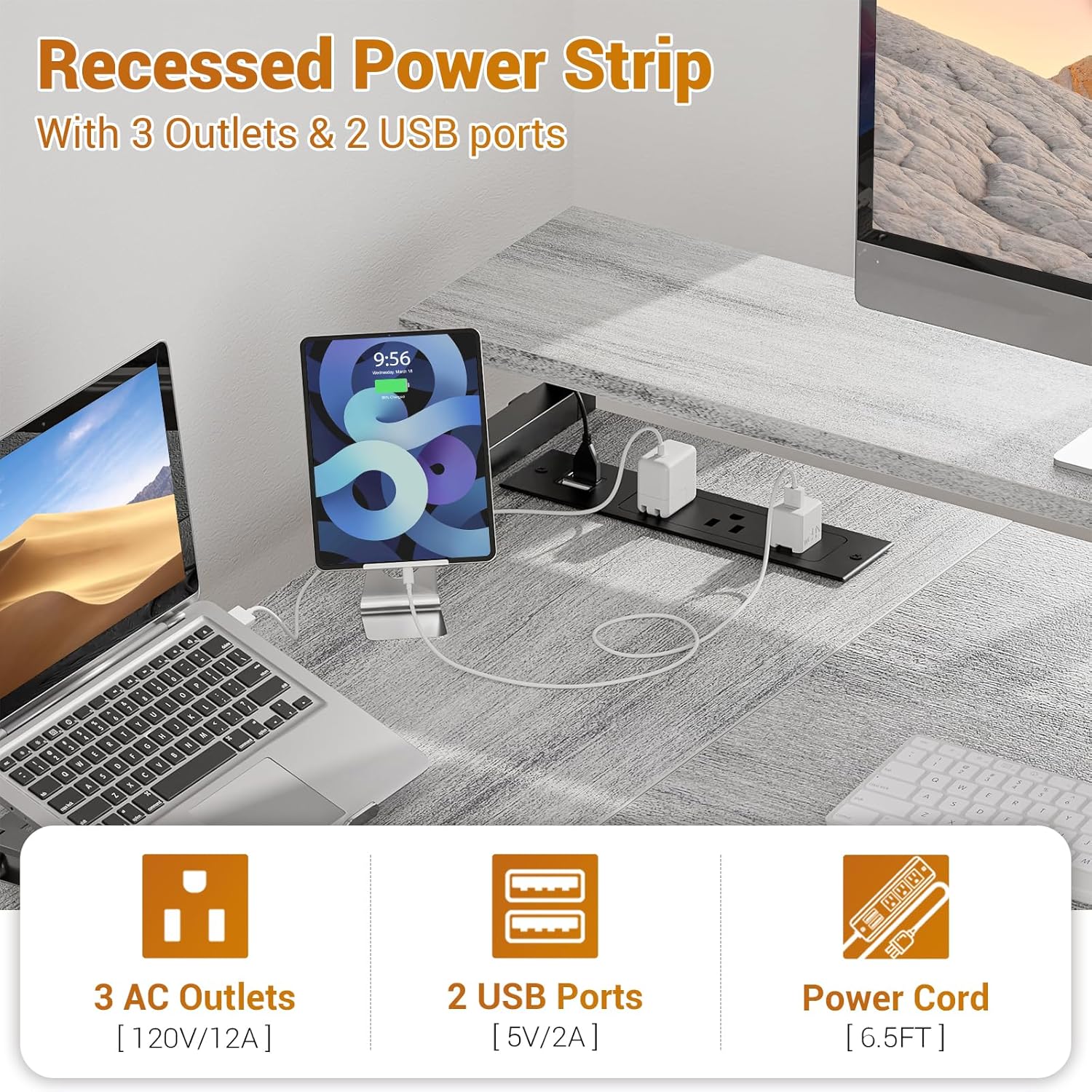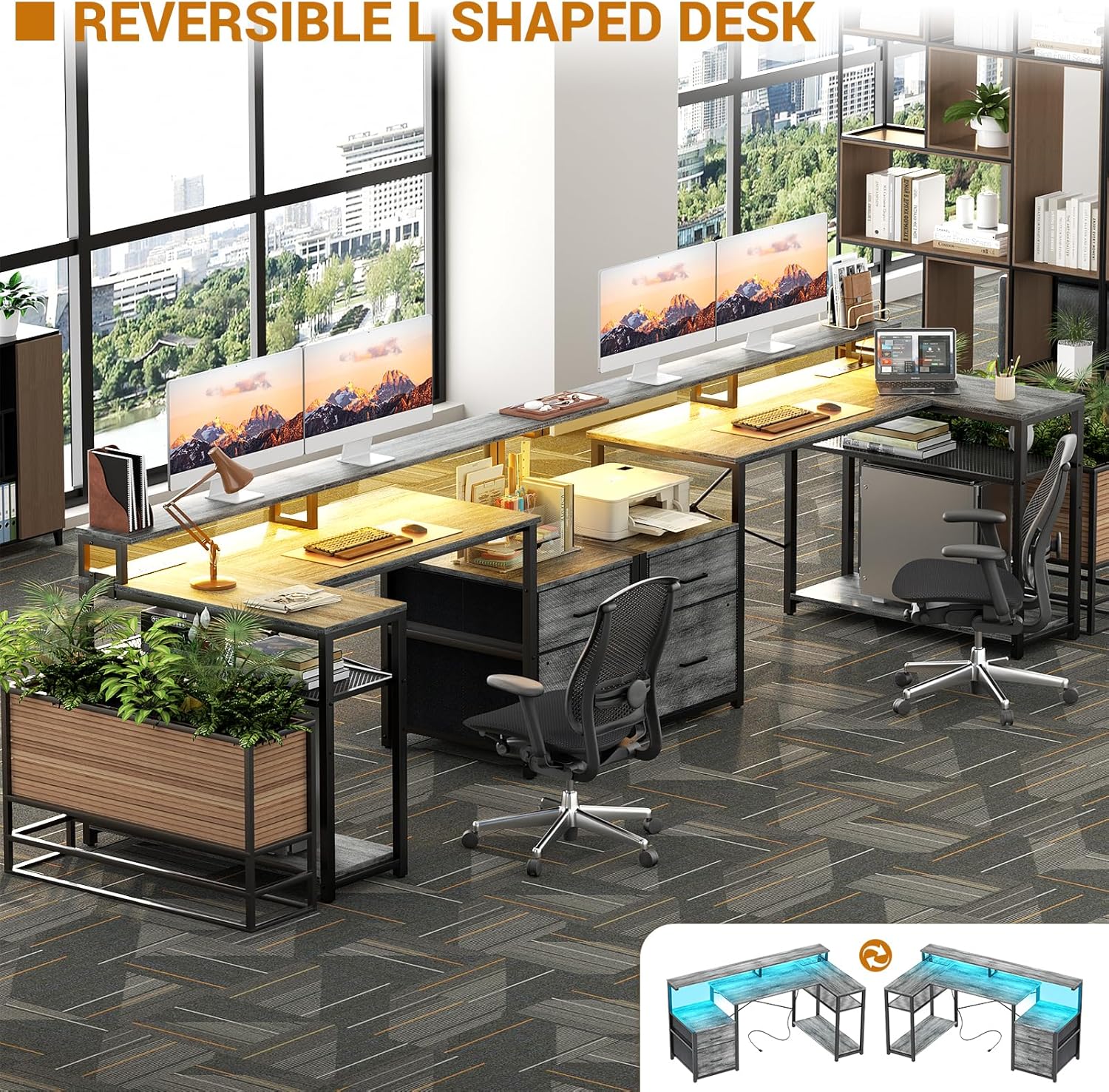 - 【L Desk With Power Outlet】Our l shaped office desk with power outlet features 3-Outlet & 2 USB Ports to provide power for up to 5 devices simultaneously. Easily providing convenient charging for your laptop, phone, ps4 and gaming devices. With reversible design, the charging station can be installed in left or right directions according to your needs.