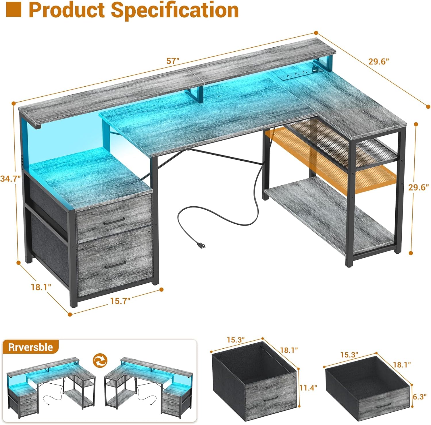 - 【Convertible Desk with Spacious Desktop】The l shaped desk with drawers is with reversible design to adapting your specific needs. Whether it's for home office working, gaming, or studying, enjoy the freedom to set it up as a left or right-corner desk. The main workstation could hold two desktop computers and one notebook. Dimension: 57"L x 29.6"W x 34.7"H