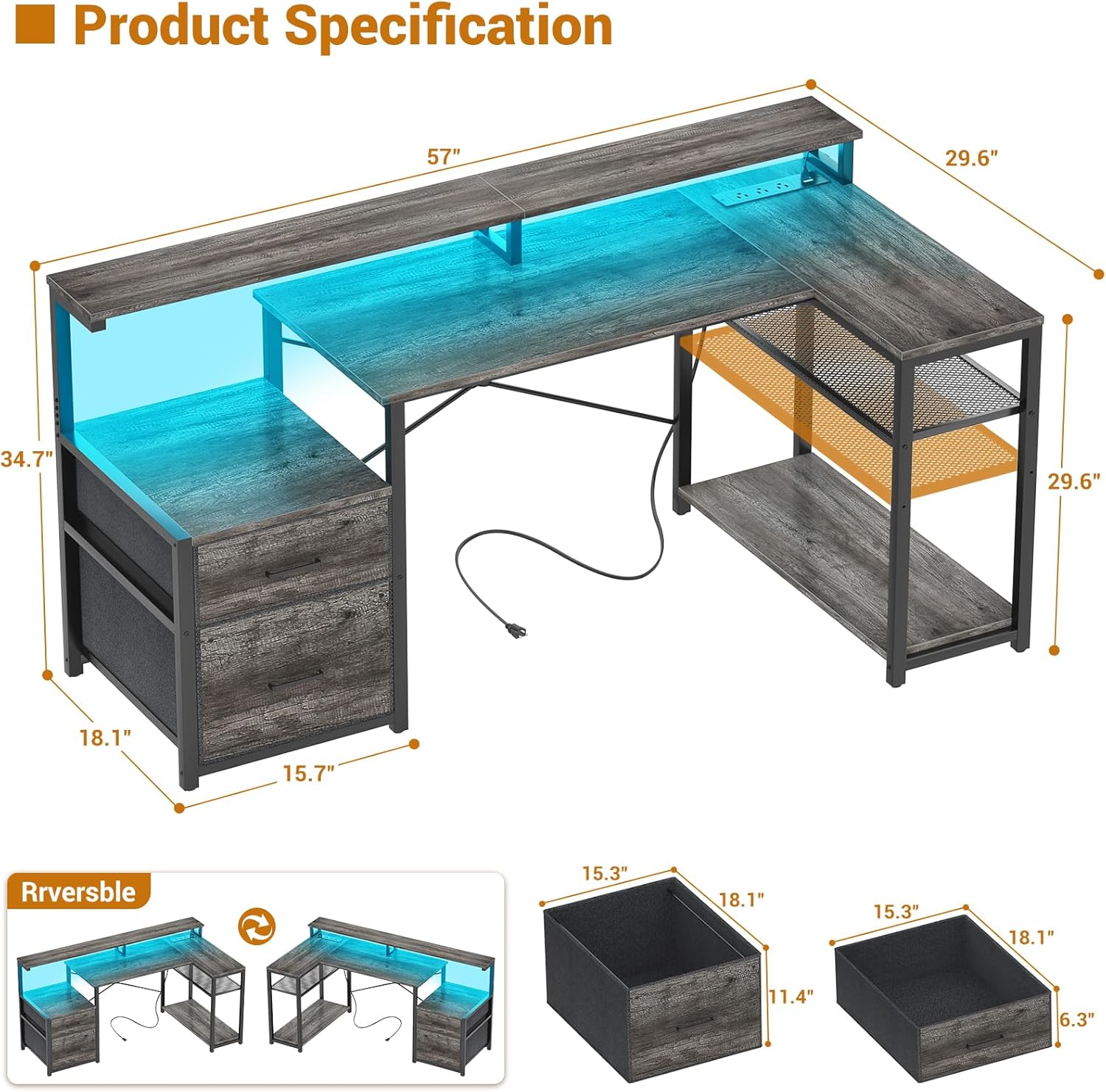 Aheaplus L Shaped Desk with File Drawer, Reversible L Shaped Computer Desk Gaming Desk with Power Outlet & LED Strip, Home Office Desk with Monitor Shelf, Corner Desk with Storage Shelves, Grey Oak