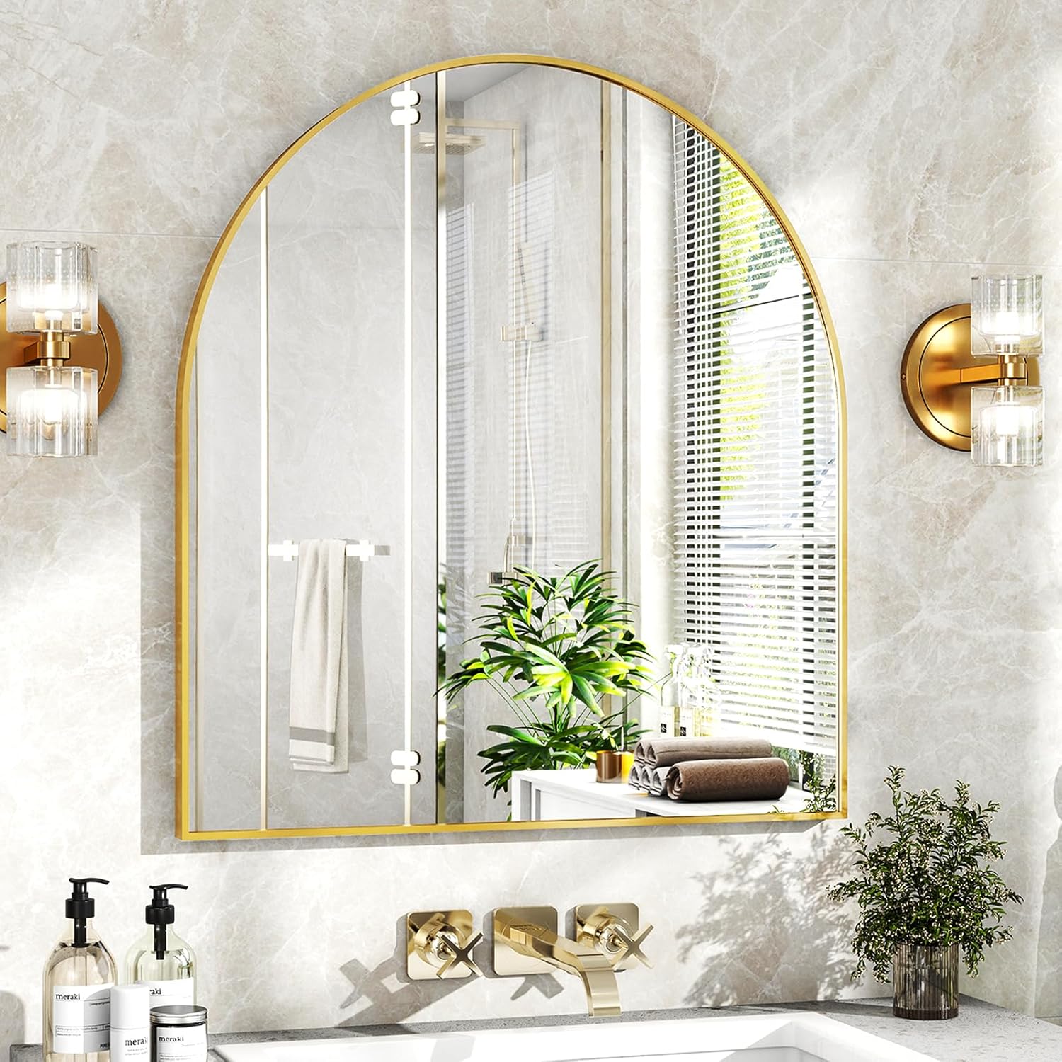 - Widely Used: This wall-mounted mirror for bathroom sink is not only a hanging mirror for wall, but also a mirror that can be leaned against the wall. This gold frame mirror features a simple and versatile style, making it an exquisite decorative mirror for any space. Perfect for bedrooms, living rooms, bathrooms, and entryways, this arched gold vanity mirror adds a touch of luxury to your home decor