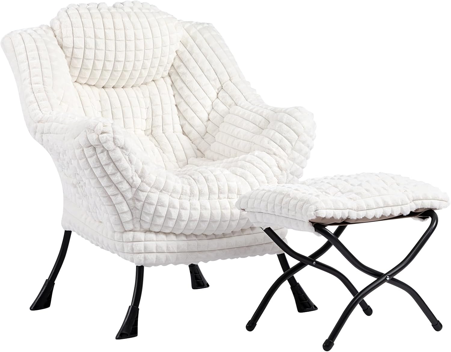 HollyHOME Fabric Lazy Chair with Foldable Ottoman, Accent Comfy Lounge Arm Chair and Folding Footrest Stool Set, Leisure Sofa Reading Chair and Footstool for Living Room, Bedroom, Dorm, Faux-Fur White