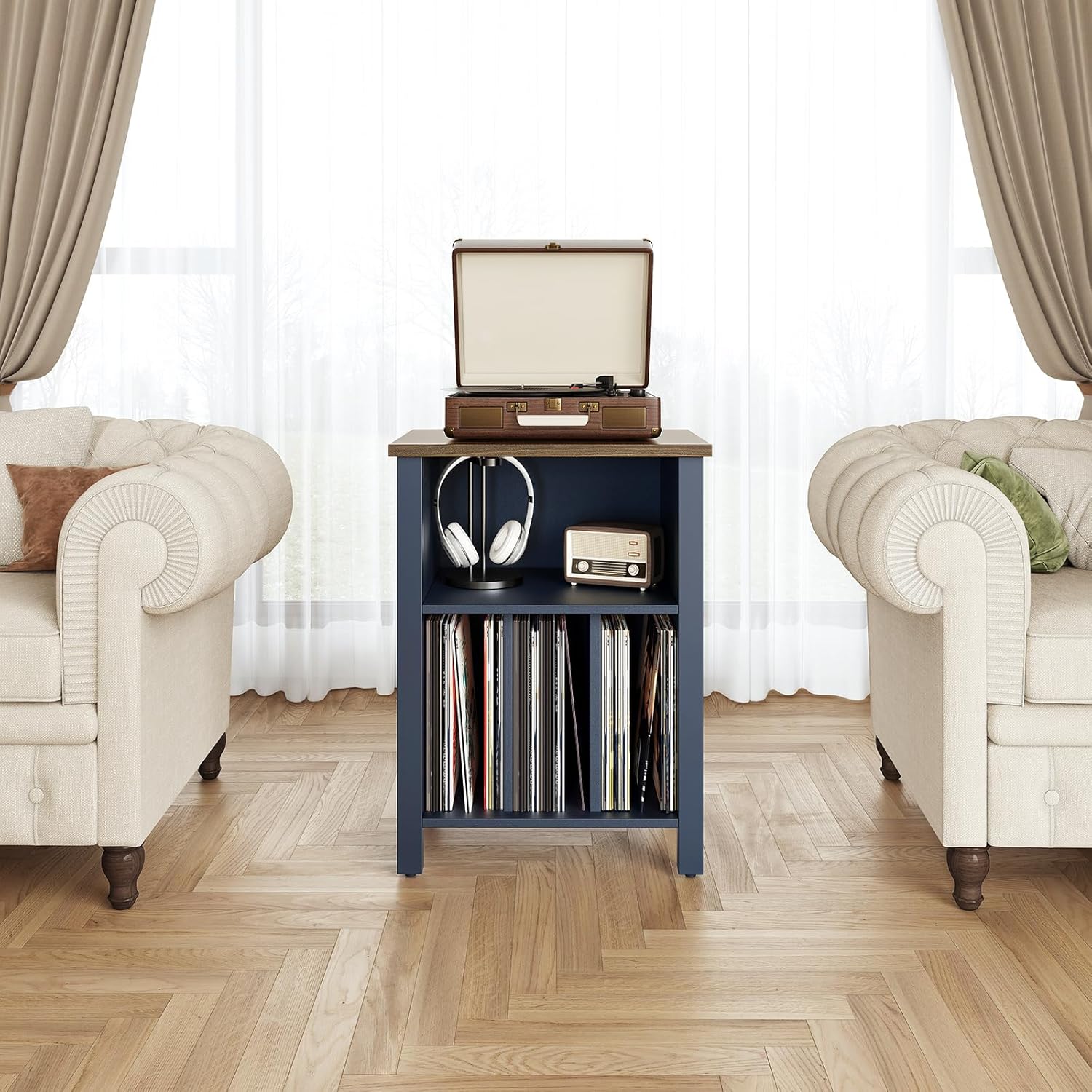 - Vintage Record Stand- This record storage is built with a wood frame and designed in a classic farmhouse style, giving it a unique elegance. It can function as a vinyl stand as well as a bedside table, nightstand, or side table. You can place it in your living room, bedroom, music room or office