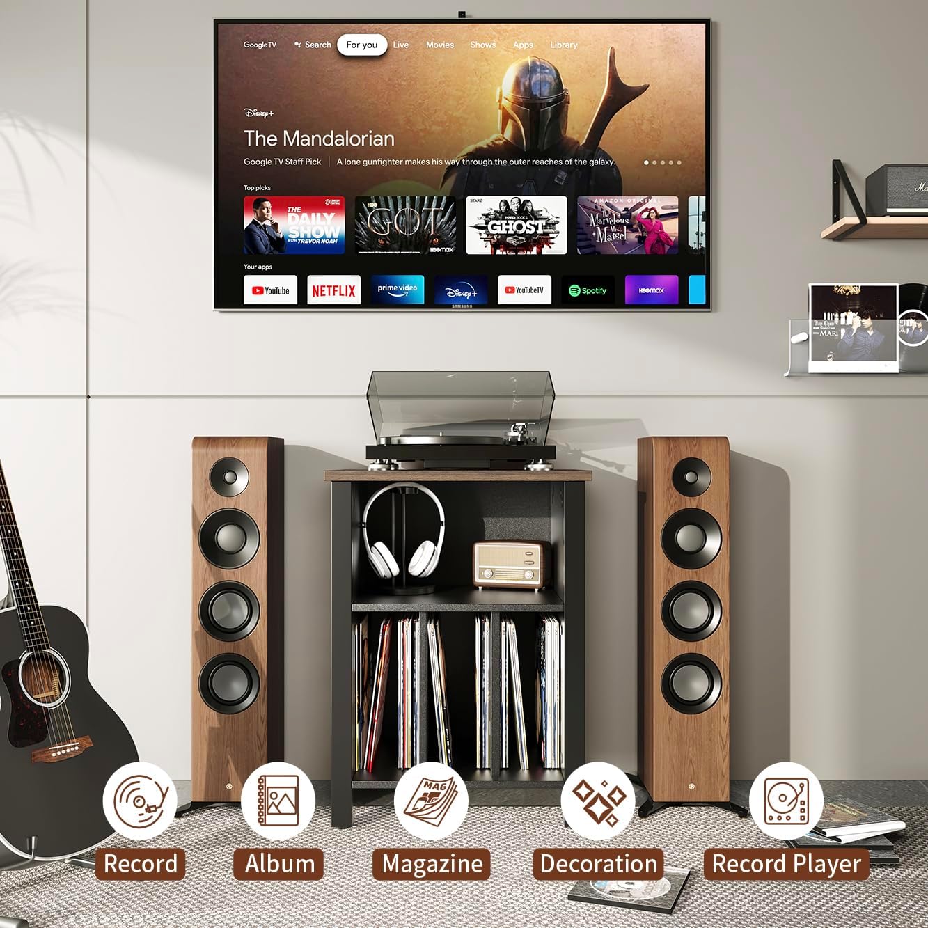 - Multipurpose Display Stands- This end table offers three separate storage spaces. The top layer is designed for the turntable, the middle layer for audio accessories, and the bottom section with dividers for vinyl records. It's perfect for storing vinyl records, albums, magazines, and other items