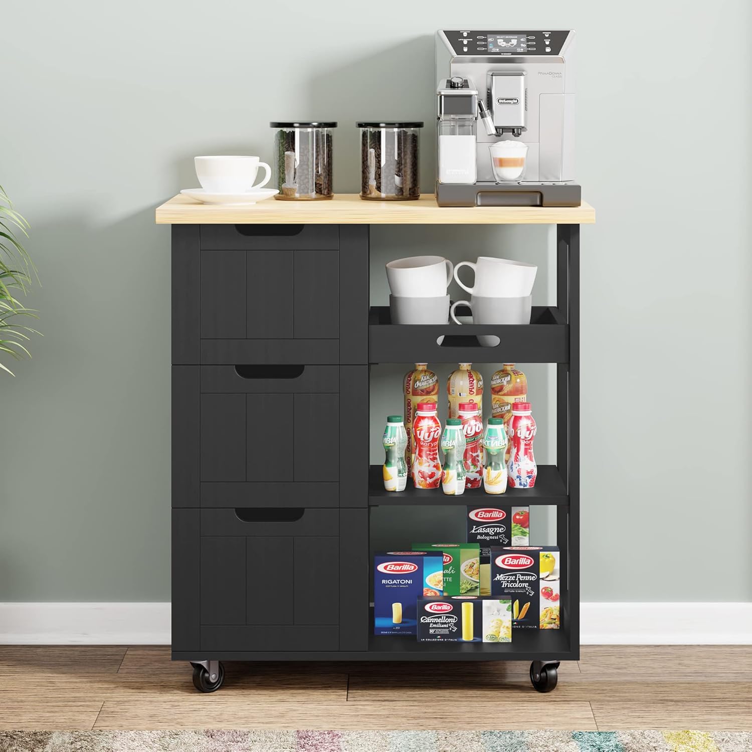 - Convenient kitchen organizer: This kitchen island is sturdy enough to Store a variety of daily equipment and machinery. Drawers are perfect for storing napkins, cutlery, while open shelve will provide plenty of space for small appliances.Towel racks can hold kitchen paper and towel.