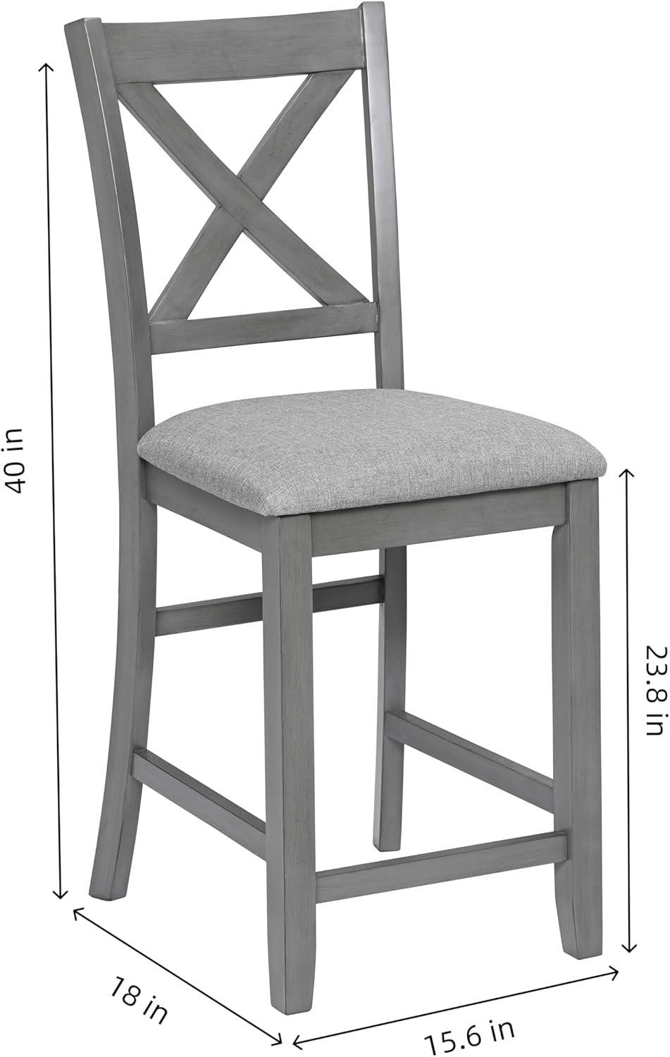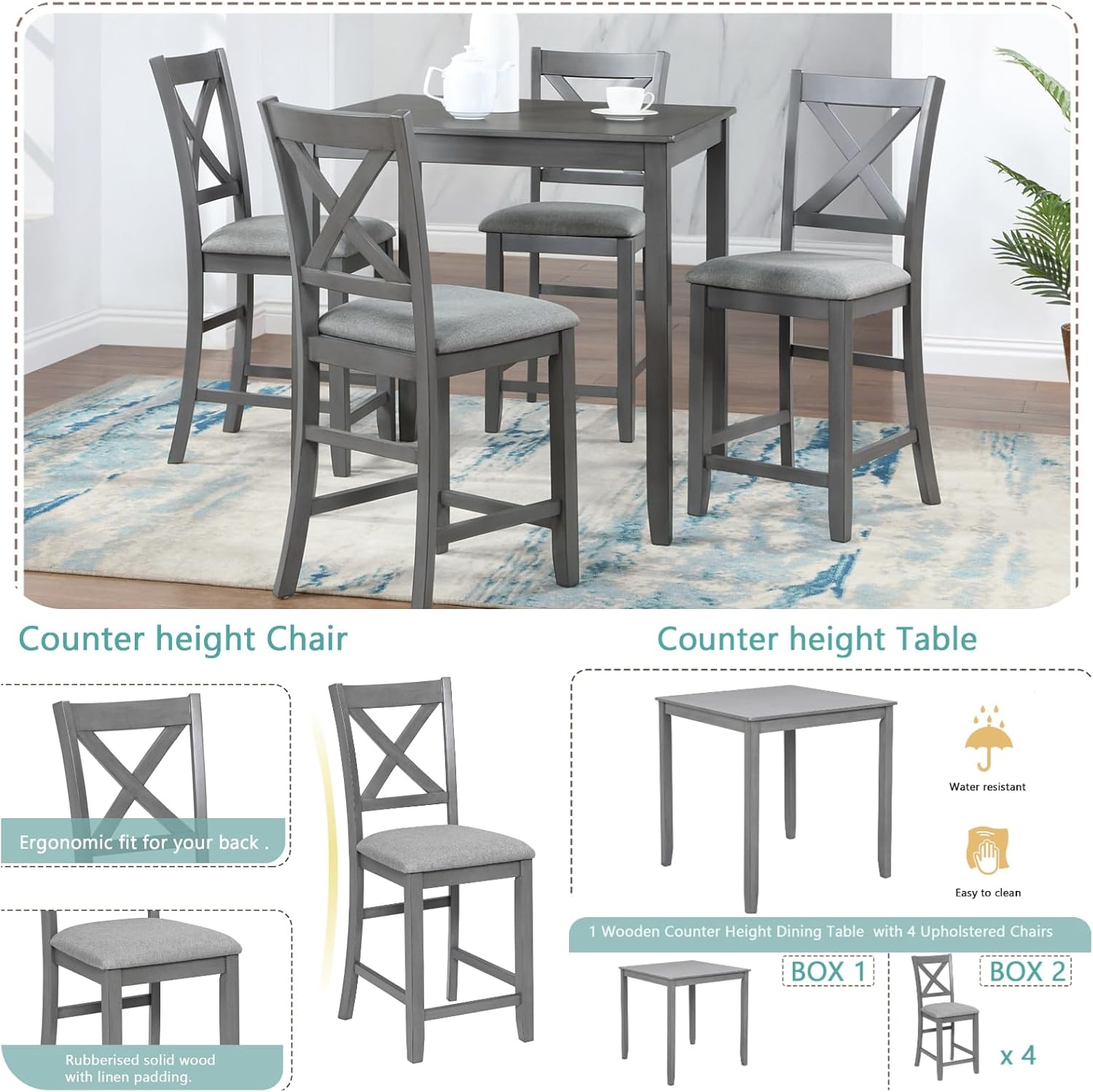 5PCS Dining Table Set, Counter Height Kitchen Table Set with Square Table and 4 Upholstered Chairs, Square Dining Table Set for 4, Gray