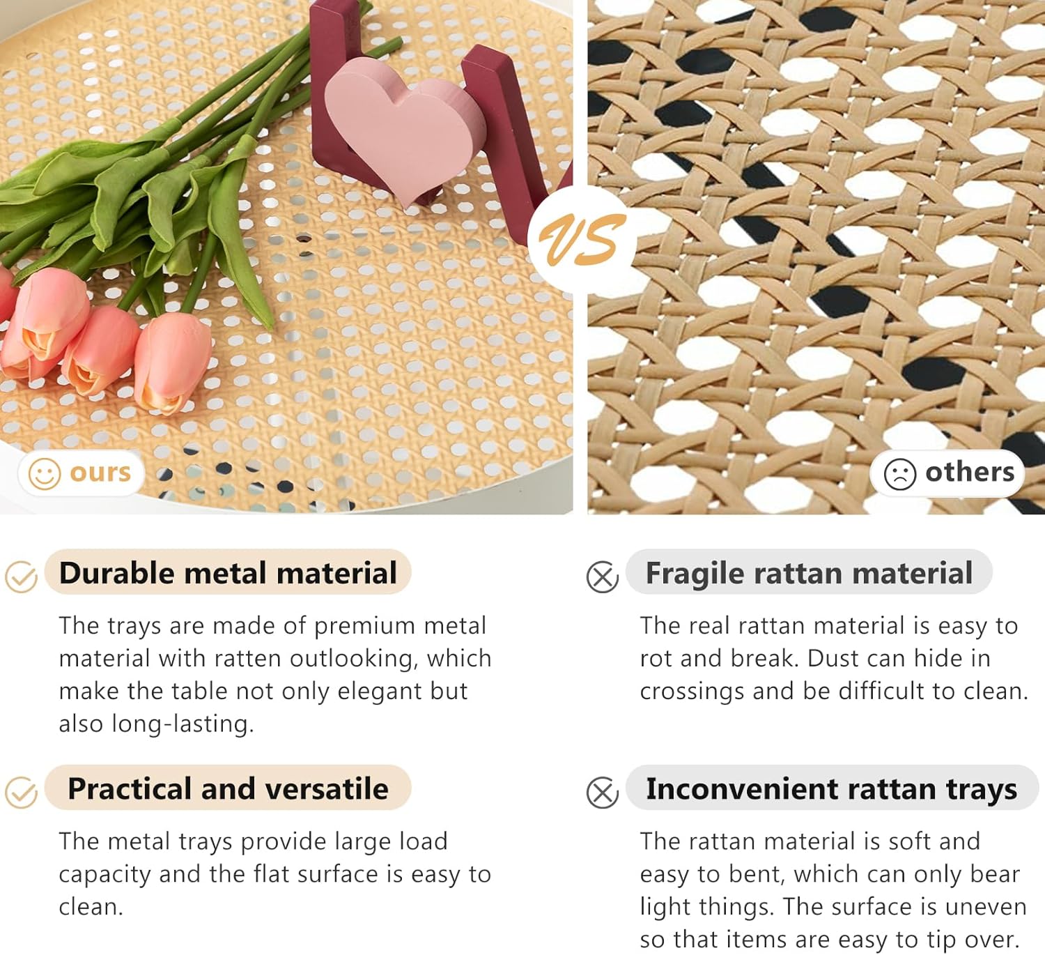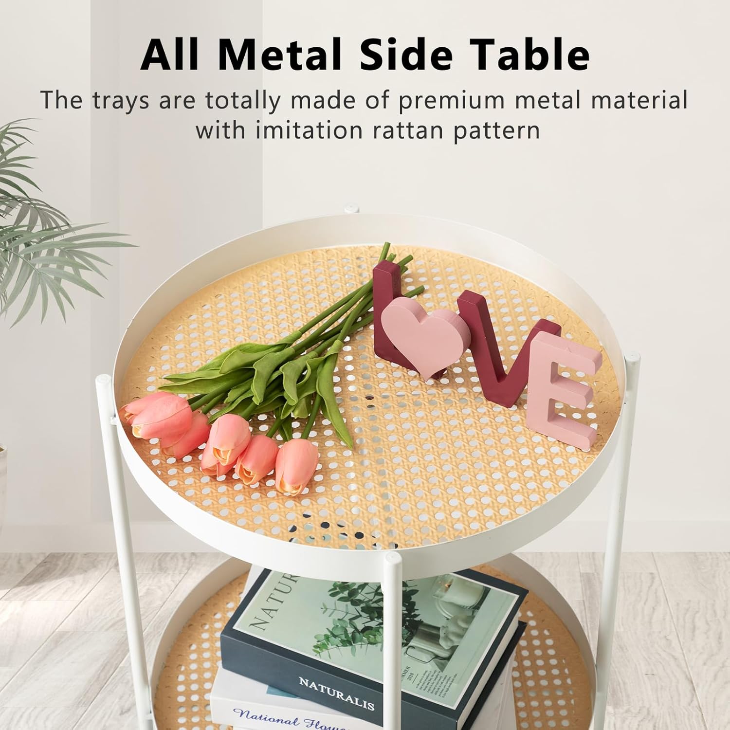 danpinera All Metal Side Table, 2 Tier Anti Rust Small Table with Imitation Rattan Pattern on Removable Trays for Living Room, White Round Nightstand for Bedroom, 20.47 Inch x 16.54 Inch Pearl White
