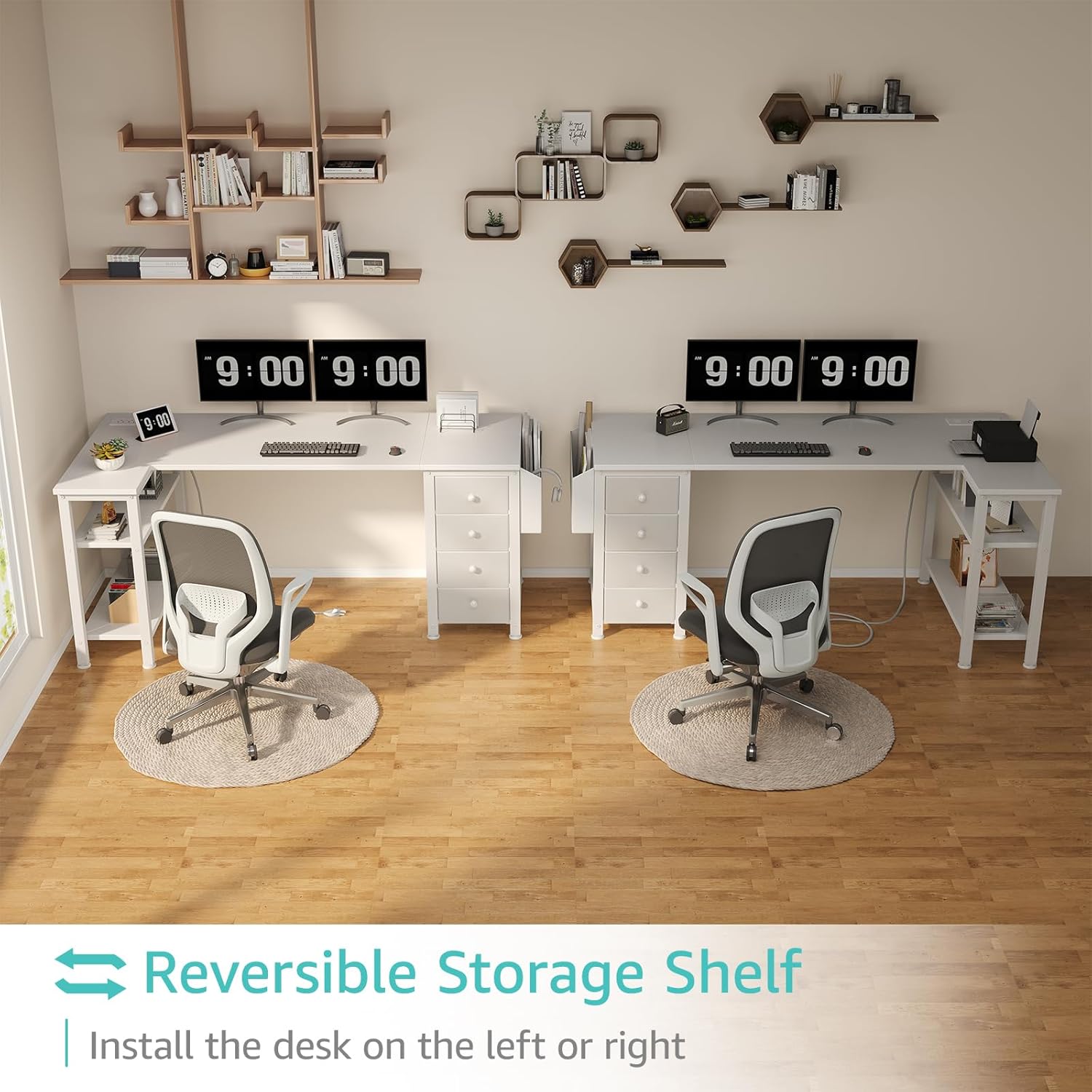 Lufeiya White L Shaped Desk with Drawers & Storage Shelves, 55 Inch Corner Computer Desk with Power Outlet for Home Office Bedroom, L-Shaped Teen PC Desks with Fabric Drawer, White