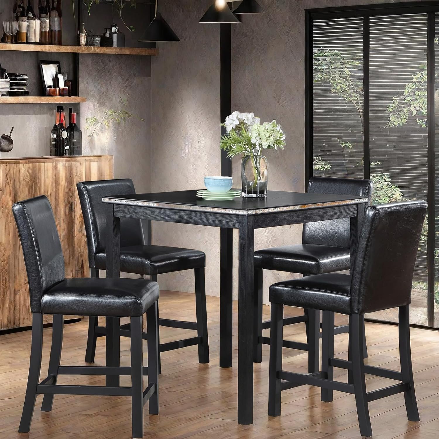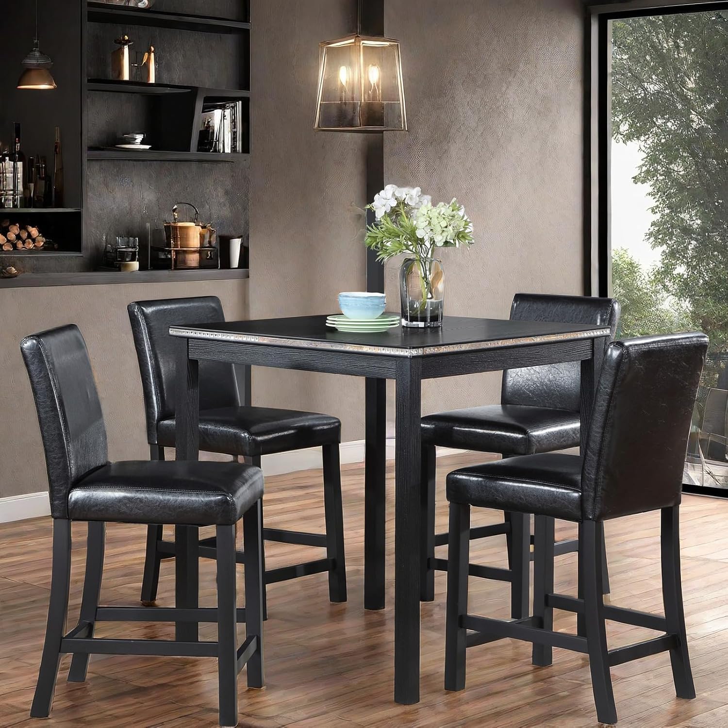5PCS Wooden Counter Height Table Set, Square Table and 4 Upholstered Chairs, Dining Table with Crystal Decoration, for Kitchen, Dining Room,Black