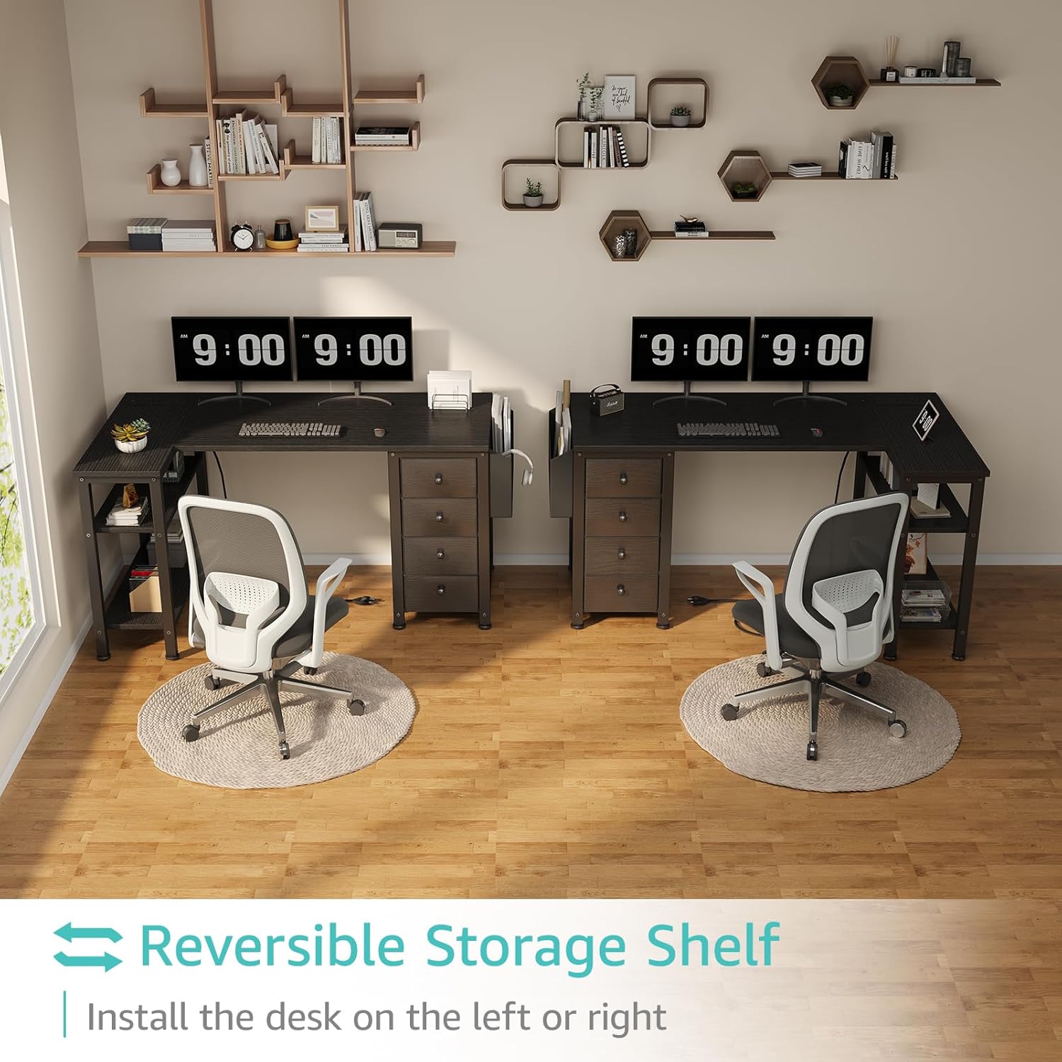 - Modern Simple Style Design: Computer desk with 2 storage shelves and 4 ππππ§ππ πΏπ§ππ¬ππ§π¨, you can try this two installation methods (left or right), and the shelves have two different heights of installation, you can customize the storage space to your needs. This desk is made of thick P2 particle wood board with scratch-resistant, anti-collision and waterproof, protect home office desk surface from daily wear and tear