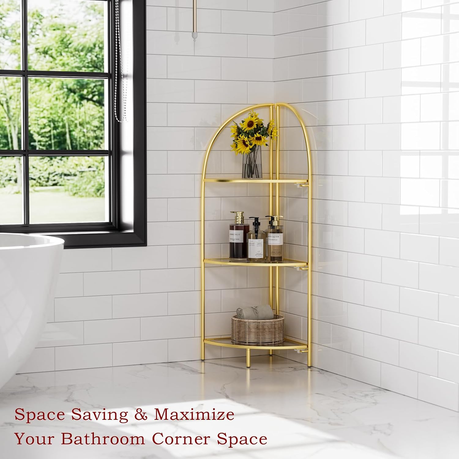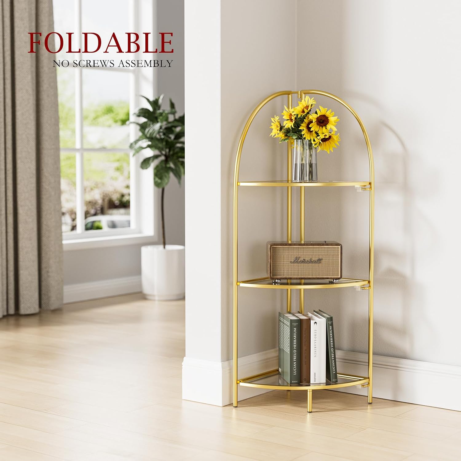 Crofy Foldable 3 Tier Corner Shelf, Metal Corner Plant Stand with Gold Frame and Transparent Shelves, Corner Display Rack Multipurpose Shelving Unit for Living Room, Bedroom, Bathroom