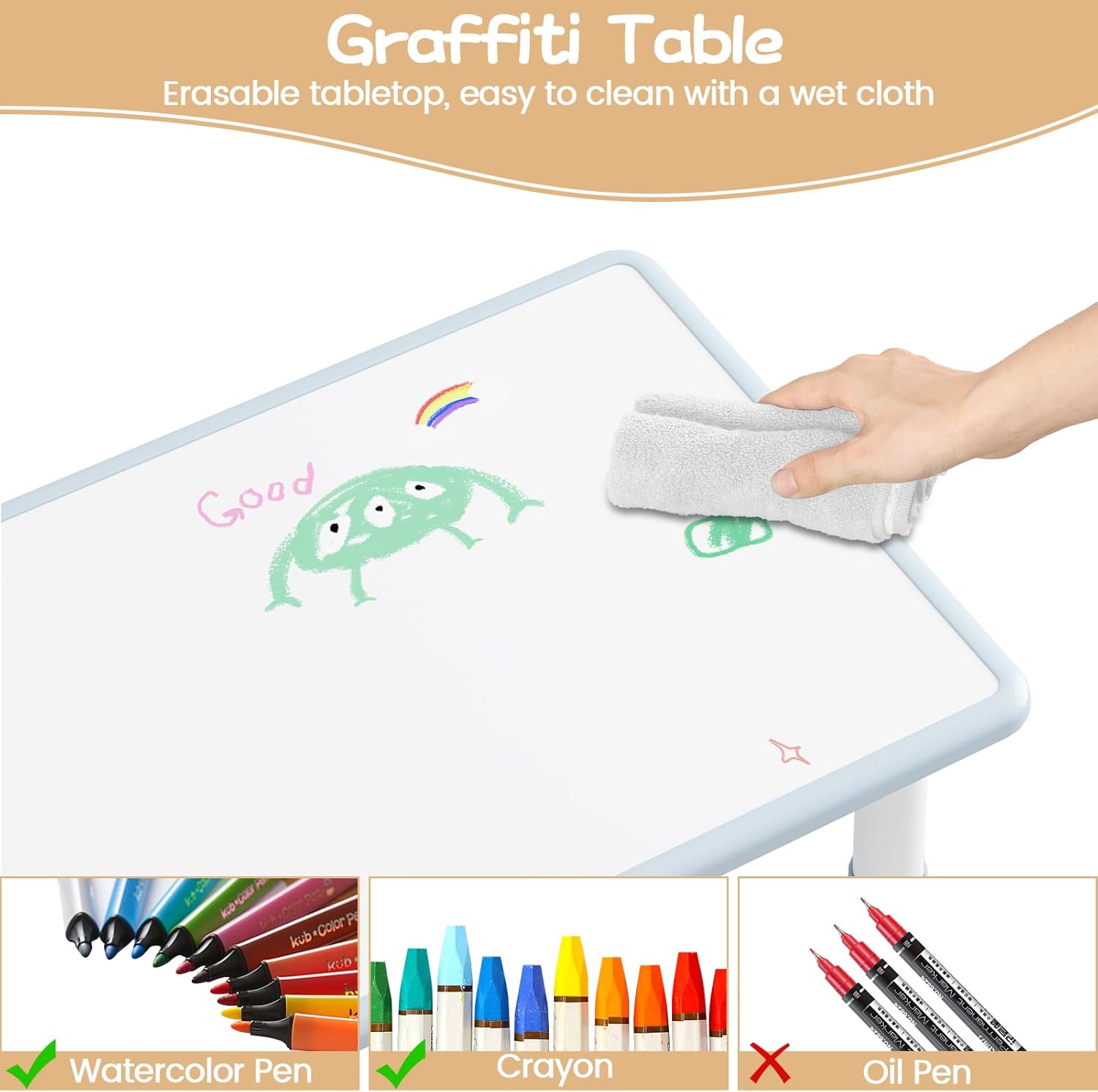 GarveeHome Kids Table and 2 Chairs Set, Height Adjustable Toddler Table and Chair Set for 2, Graffiti Desktop, Non-Slip Design, Children Table for Home Daycare Preschool for Ages 2-8, Gray Blue