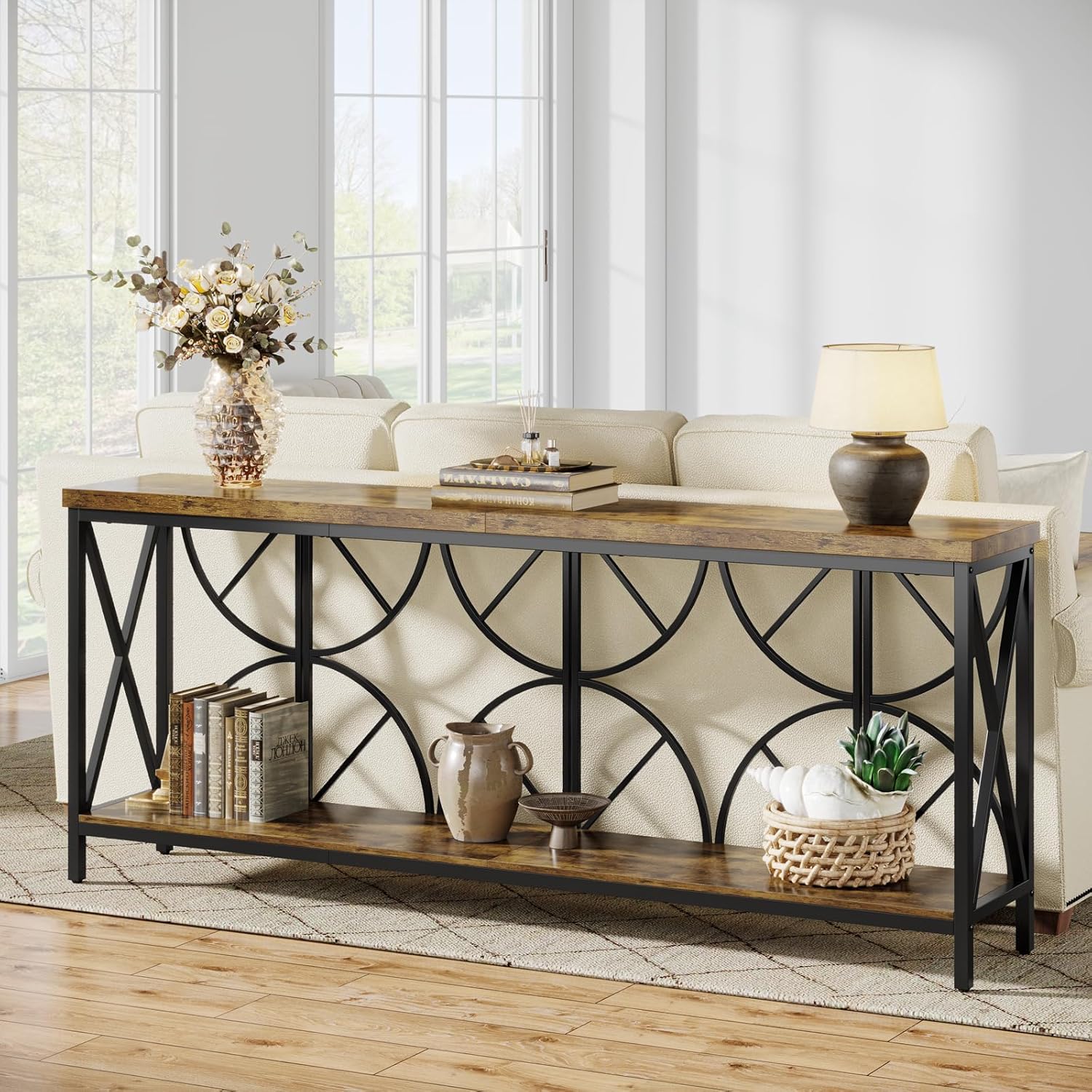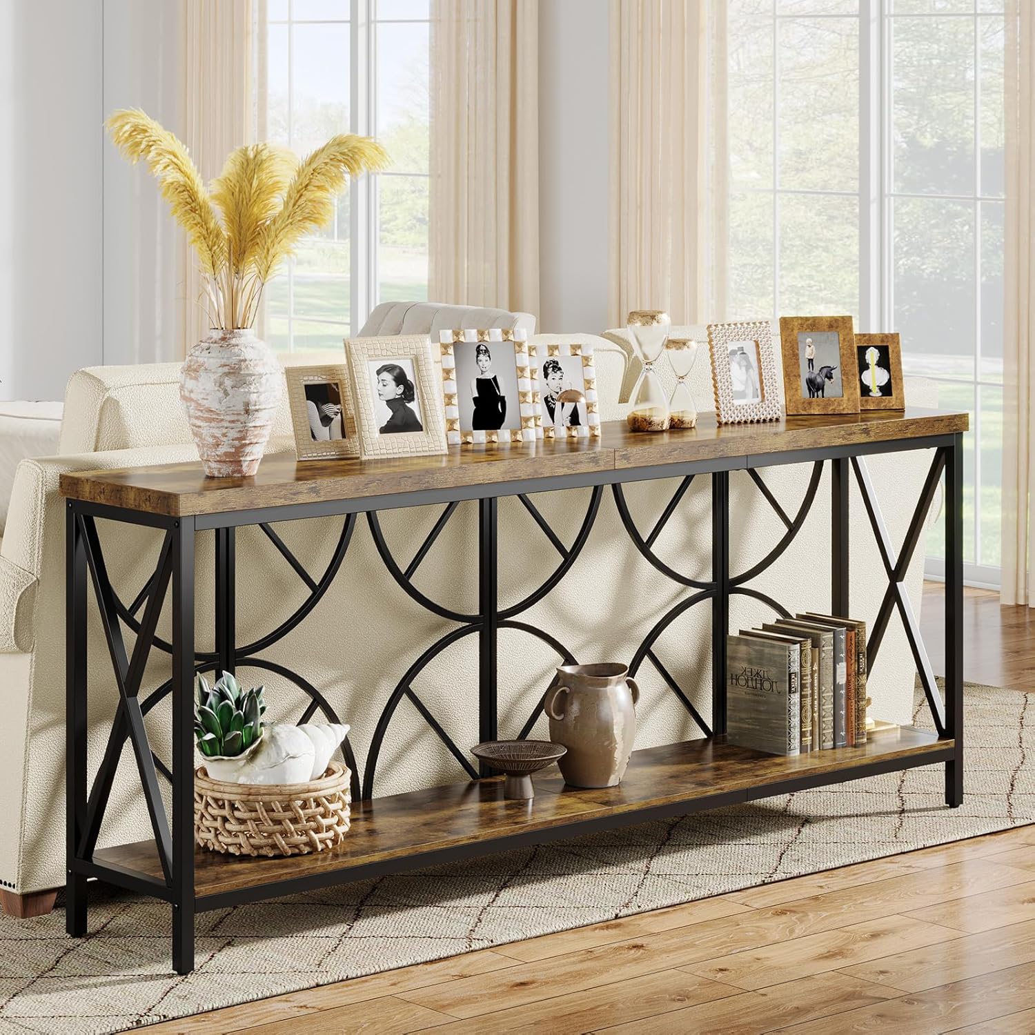 - Generous Storage Capacity: This 70.9-inch long sofa table is equipped with 2 tiers of open shelves, offering you an abundance of storage space. From cherished books, elegant lamp, family photos to assorted decorations, this behind couch table allows you to organize and store them intuitively while keeping them easily accessible. The result is a clutter-free surface and a more organized living space