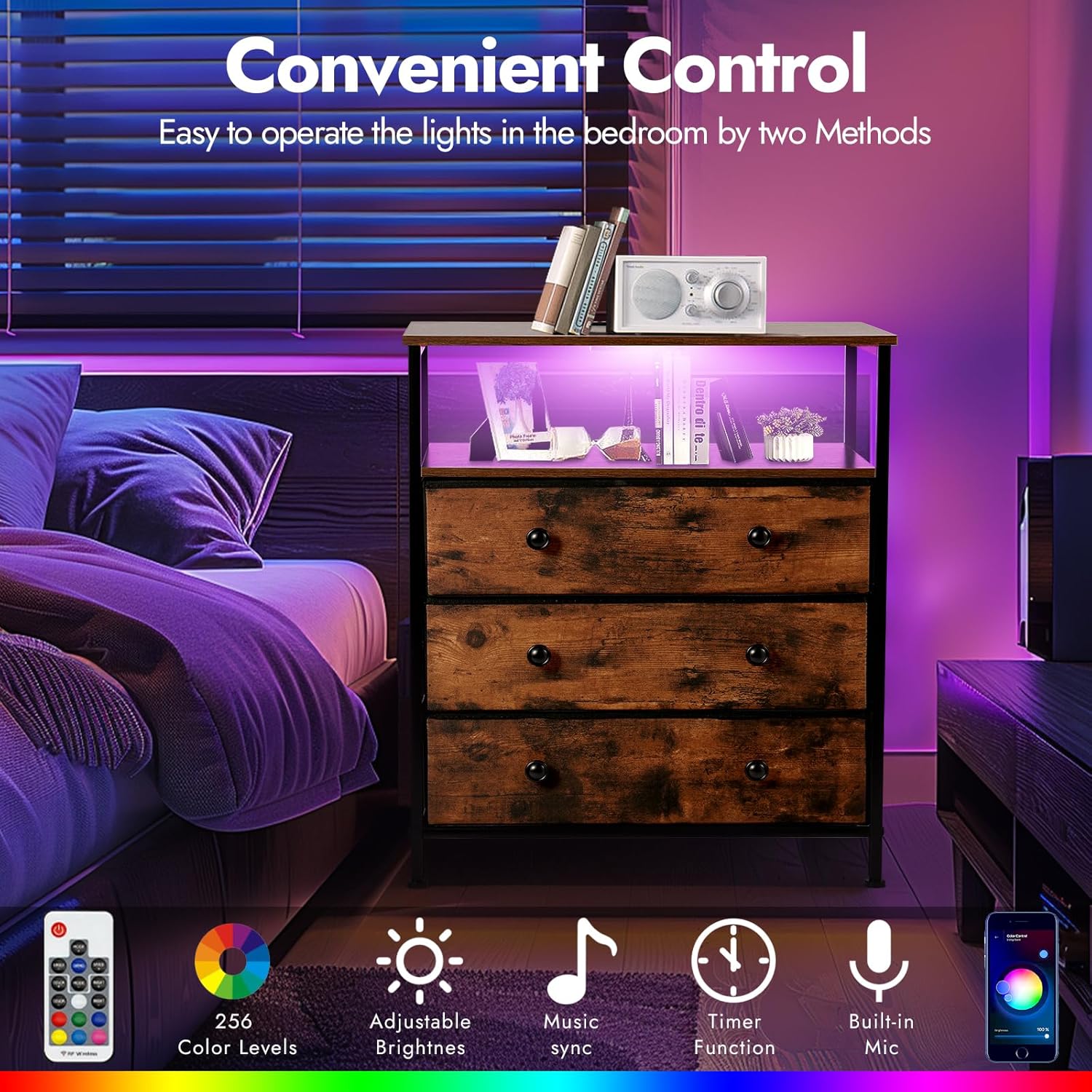 - 【Charming LED Night Stand】PATAVOT night stand is equipped with a multifunctional RGB light strip with 256 color changes and lighting effects, music synchronization and timing functions. The color, brightness, speed and various flashing modes can be adjusted at any time by remote or APP. When you play music, the LED will even dance in sync with the rhythm. Light up your home with colorful LEDs, so that your room is no longer dark, spend a wonderful night, and create a warm and soft home atmosphere.