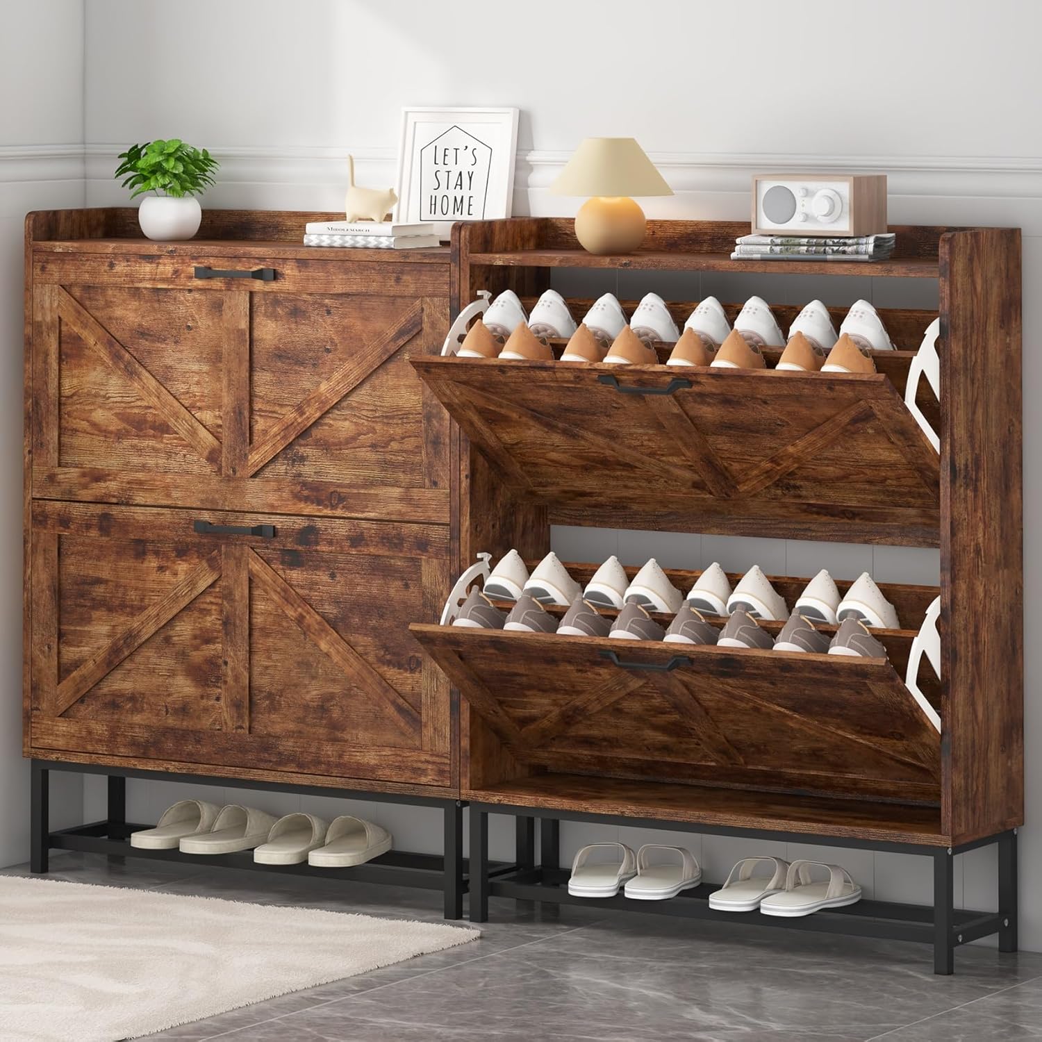 - Unique Design : This wooden shoe organizer have flip drawer design is convenient to open and close. Narrow shoe cabinet placed in back of the door, but still accommodate a large number of shoes. Each drawer has 2 layers, the panel can be adjusted or removed in two grooves to accommodate flat shoes, mid-tube boots or high heels of different heights and sizes! Effectively improve your home space utilization, the entrance no longer crowded.