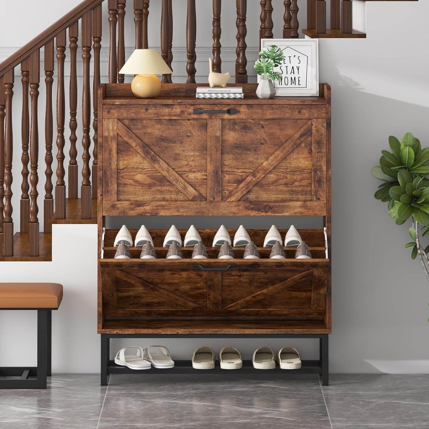 JSB Shoe Cabinet with 2 Flip Drawers, Freestanding Storage Organizer Shelf with Metal Legs, Narrow Shoe Rack Cabinet for Entryway (Rustic Brown, 2-Drawers)