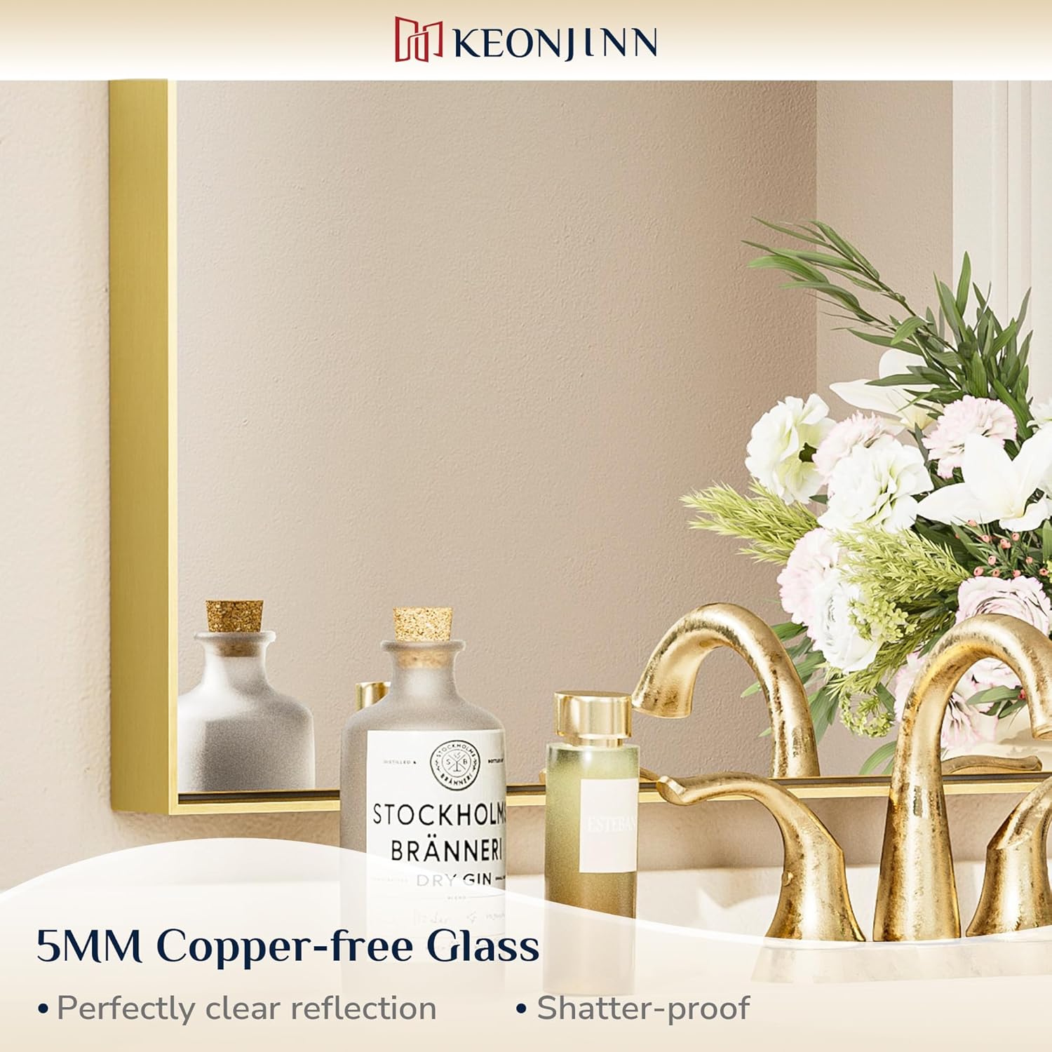 Keonjinn Brushed Shiny Gold Bathroom Mirror 22 x 30 Inch, Rectangle Gold Vanity Mirror for Wall, Aluminum Alloy Metal Framed, Modern Farmhouse, Square Corner, Brass Mirrors for Over Sink