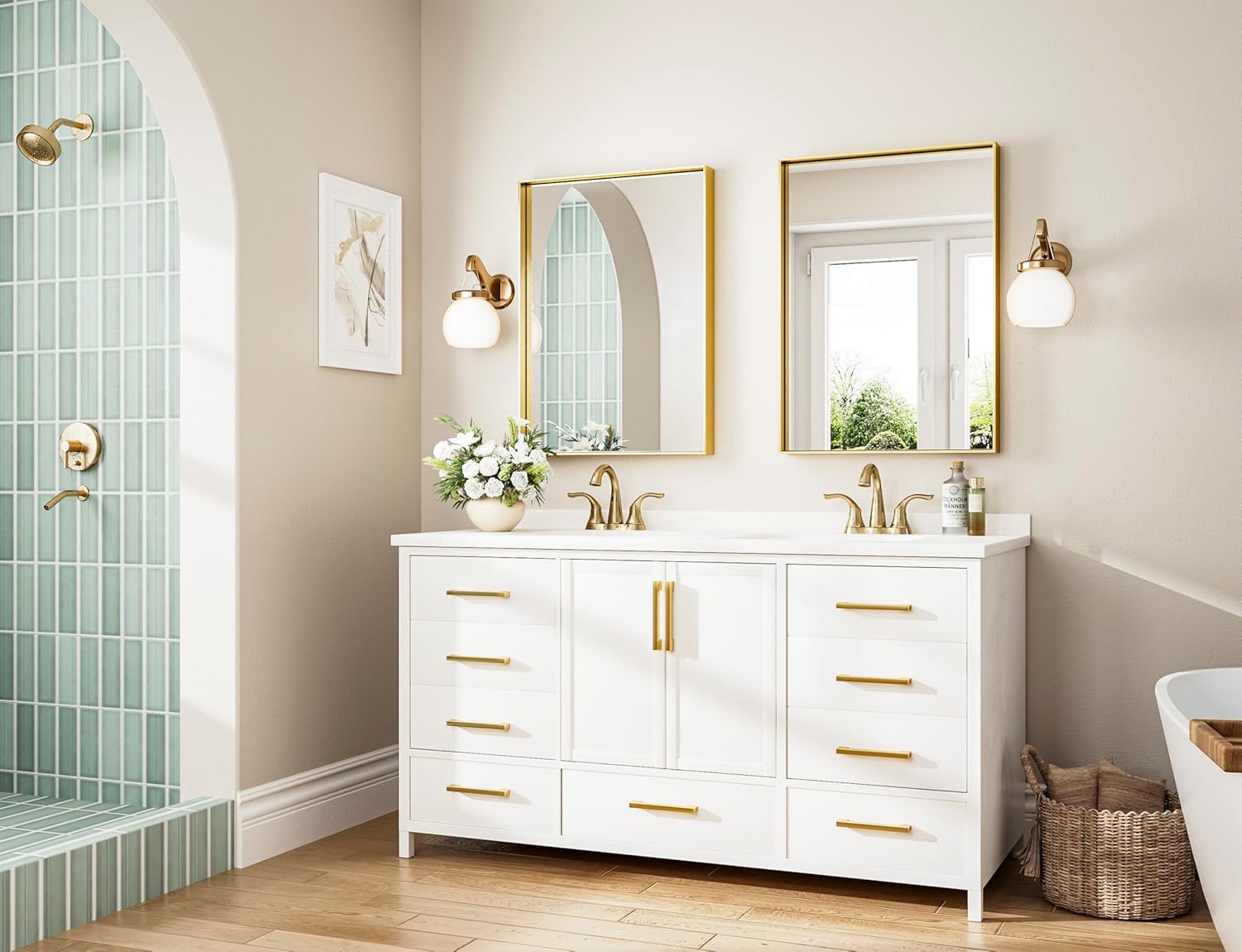 - 【Exceptional Quality】Our brushed shiny gold rectangle bathroom mirror is made of HD 5mm glass, bright and anti-distortion, which provides perfect reflection. Durable Aluminum alloy frame and PVC shatterproof film would strengthen the floating glass for safety, waterproof and anti-corrosion in wet bathroom environments.