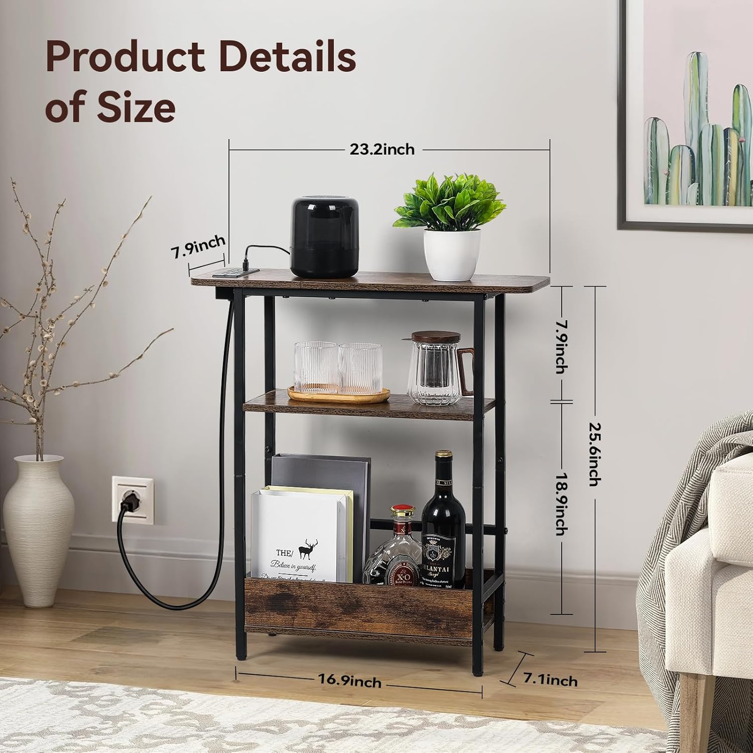 Narrow Side Table with USB-C Charging Station, 3-Tier Slim End Table with Magazine Holder, Modern Side Table for Couch or Small Spaces, Skinny Nightstand for Living Room or Bedroom