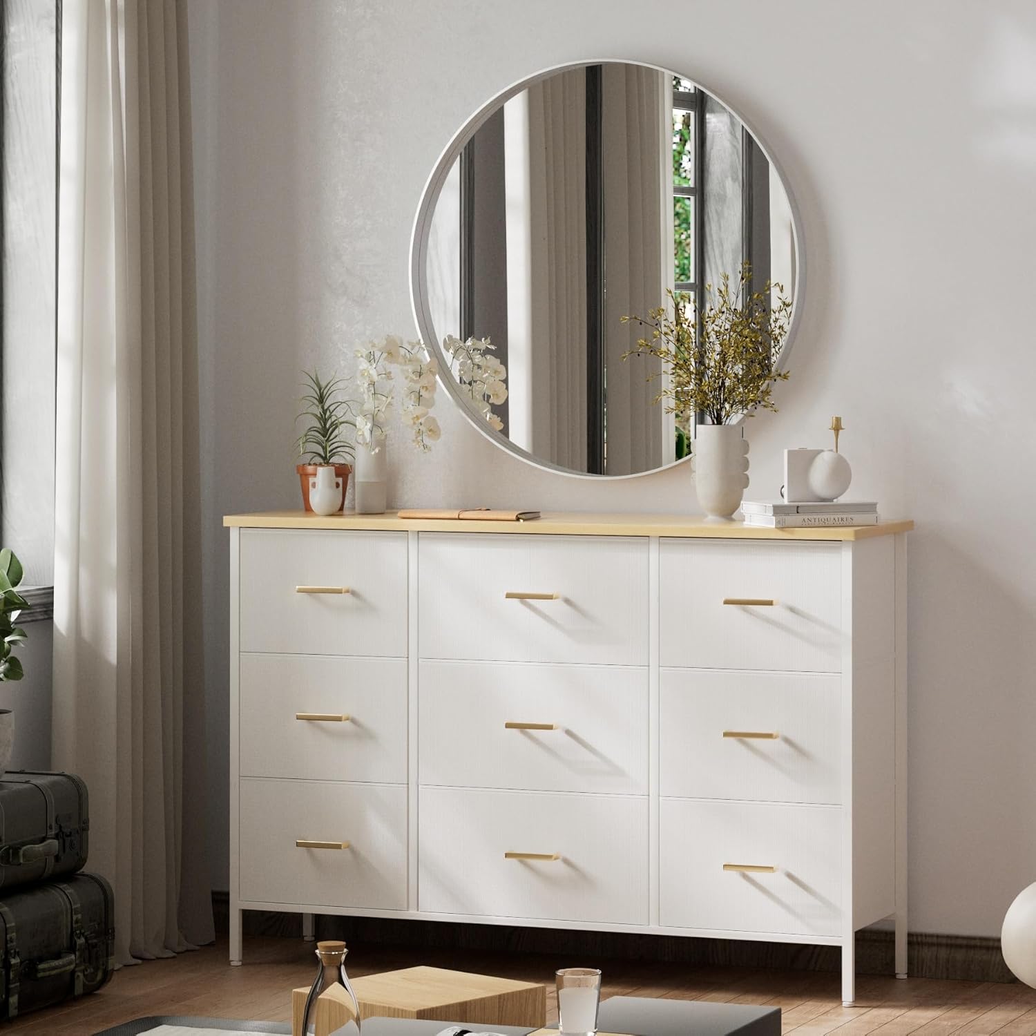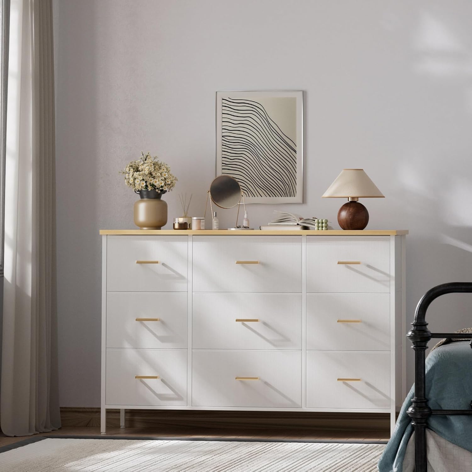 - 【Large Capacity】This wide chest of drawers has 9 drawers, each can hold up to 10 pounds. Large and deep drawers are spacious for clothes, pants, shirts, jeans, dresses, neckties, turbans, scarves and other personal accessories like socks, underwear etc. The top board can hold up to about 66 pound.