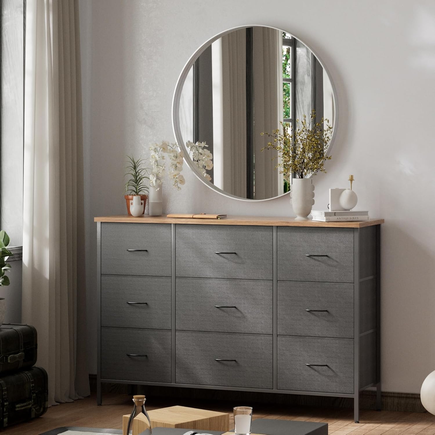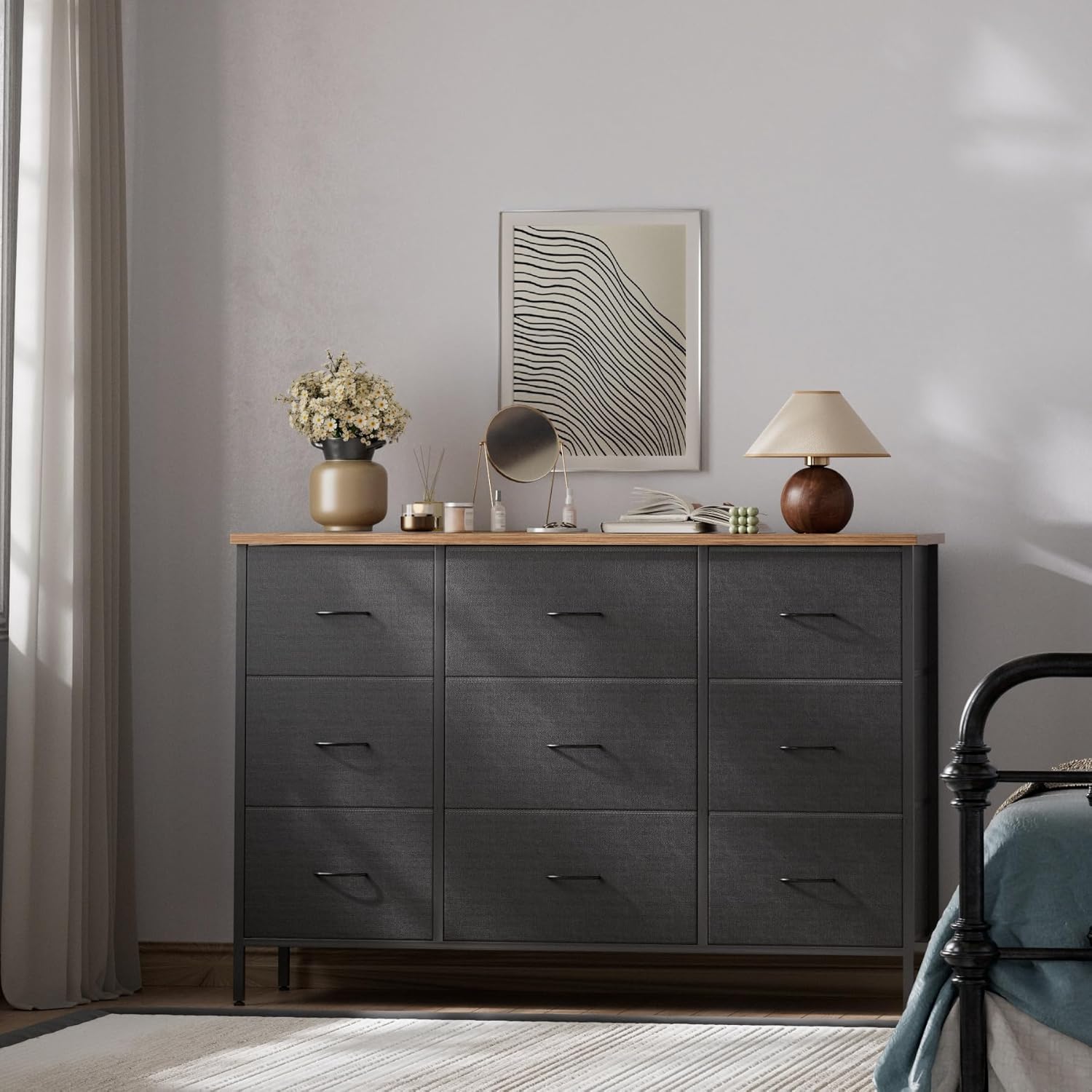 - 【Large Capacity】This wide chest of drawers has 9 drawers, each can hold up to 10 pounds. Large and deep drawers are spacious for clothes, pants, shirts, jeans, dresses, neckties, turbans, scarves and other personal accessories like socks, underwear etc. The top board can hold up to about 66 pound.