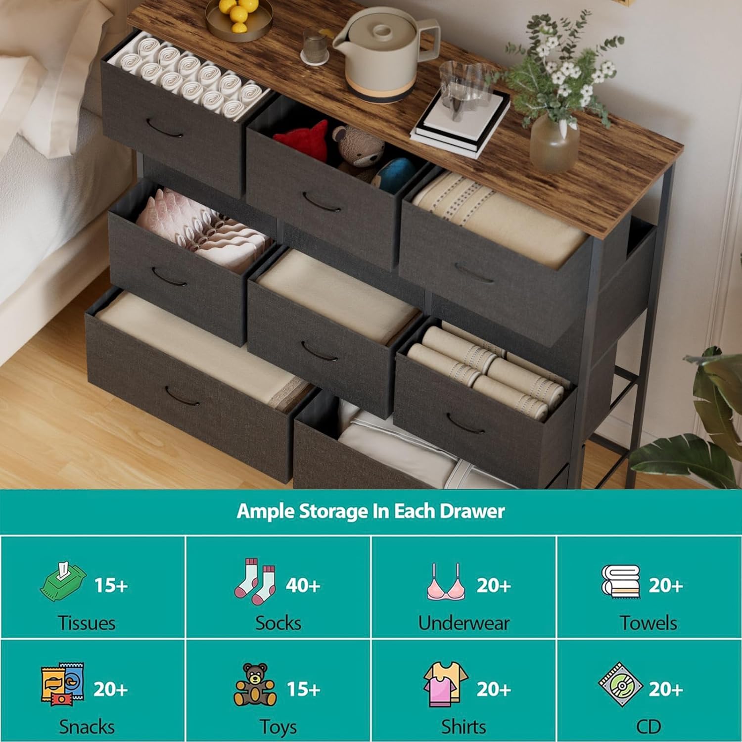 - 【Large Capacity】This wide chest of drawers has 11 drawers, each can hold up to 10 pounds. Large and deep drawers are spacious for clothes, pants, shirts, jeans, dresses, neckties, turbans, scarves and other personal accessories like socks, underwear etc. The top board can hold up to about 66 pound.