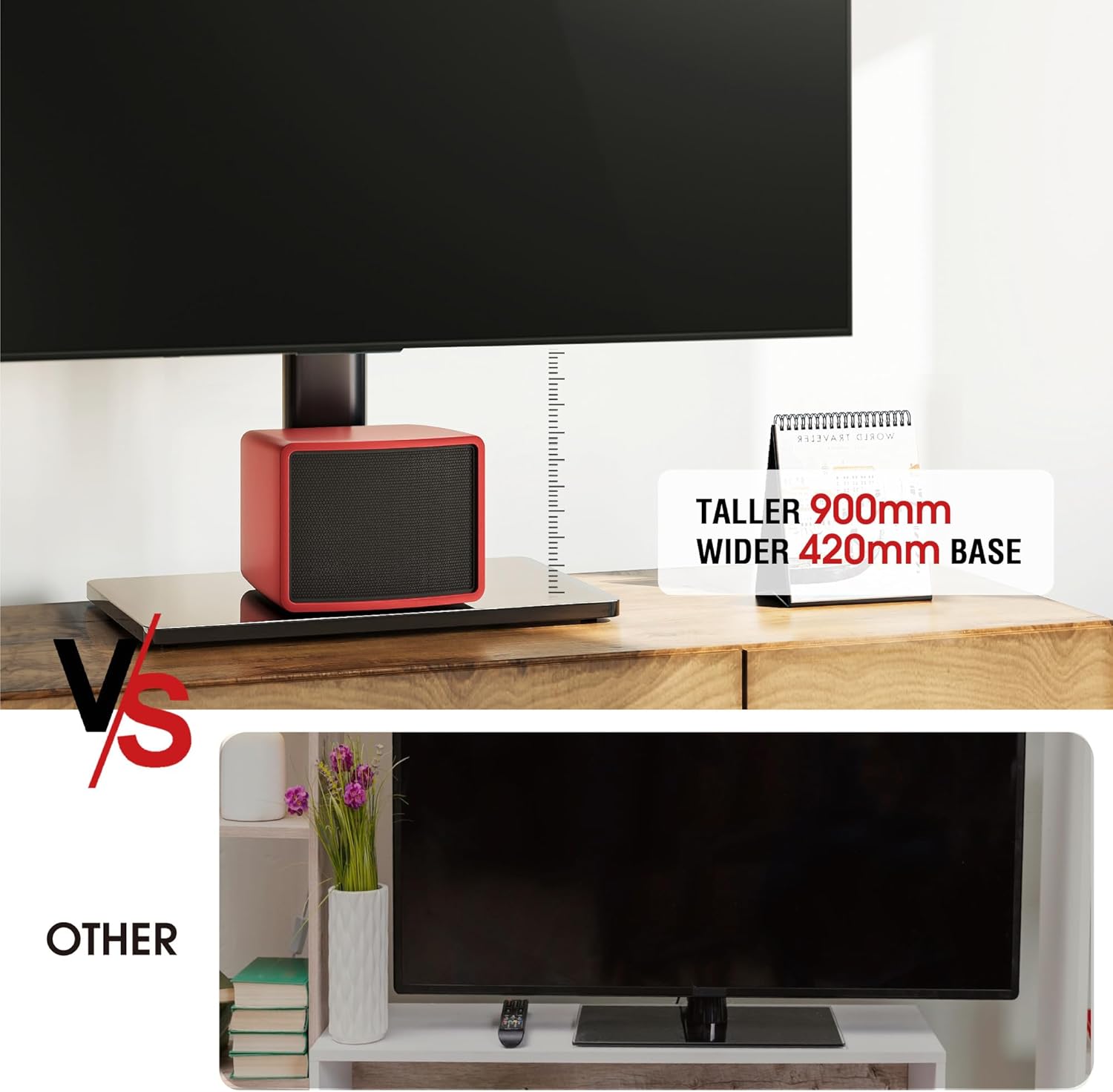 - Universal TV stand Holds Most TVs: The table top TV stand fits 32",40",42",50",55",60",65",70",75" flat-panel LCD/LED TVs, with VESA pattern sizes from 100x100mm, 100x200mm, 200x100mm, 200x200mm, 200x300mm, 300x200mm, 300x300mm, 400x200mm, 400x300mm, 400x400mm, 400x600mm. Please verify the VESA pattern of your TV before purchase
