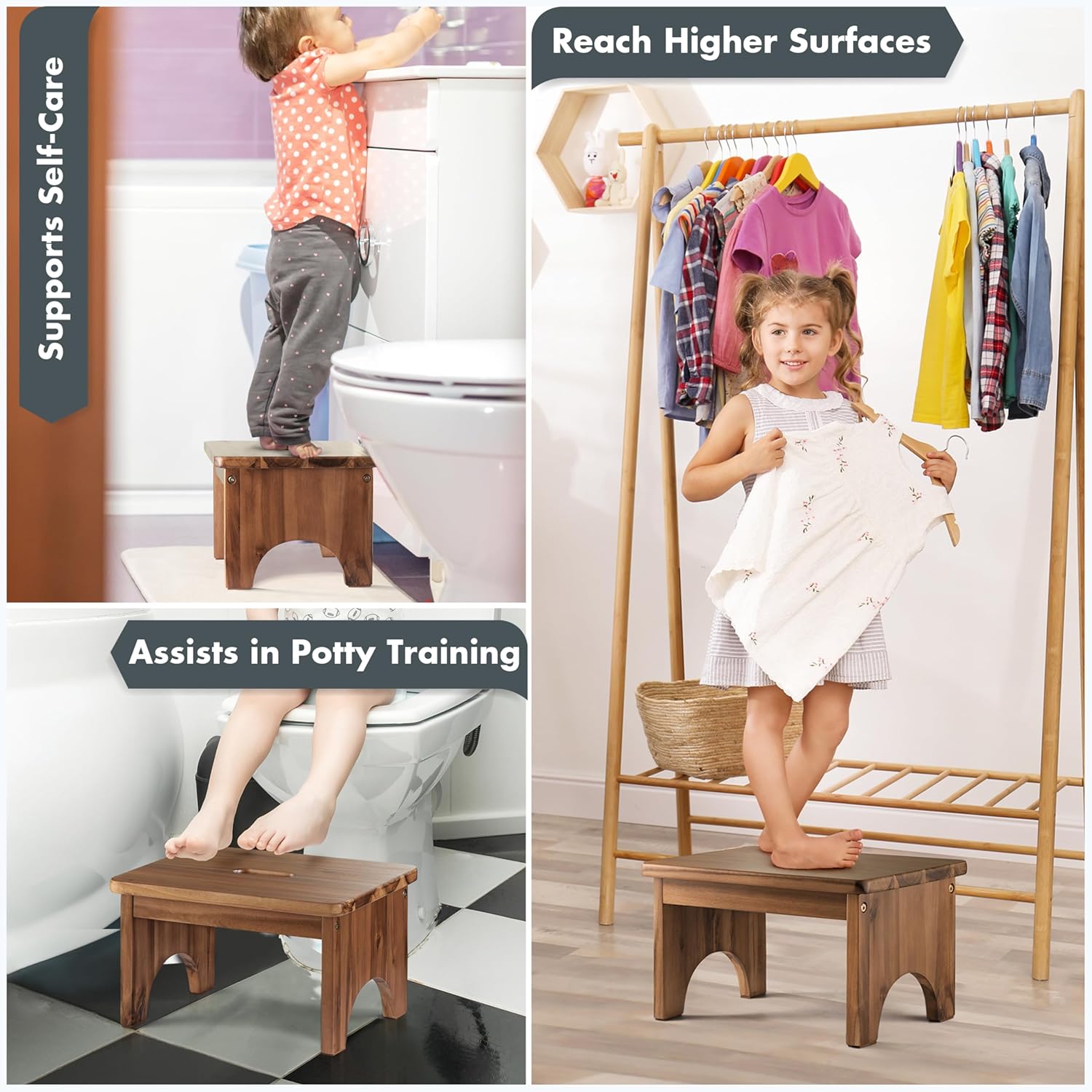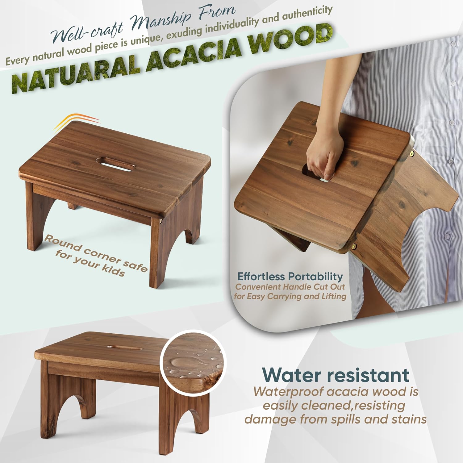 - 🌲 NATURAL ACACIA WOOD - Discover the enduring charm of Acacia wood in our step stool. Crafted for robustness, water resistance, and anti-warping, it's a functional and aesthetically pleasing addition to your space. The distinct wood grains make each stool unique, celebrating the beauty of nature in your home.