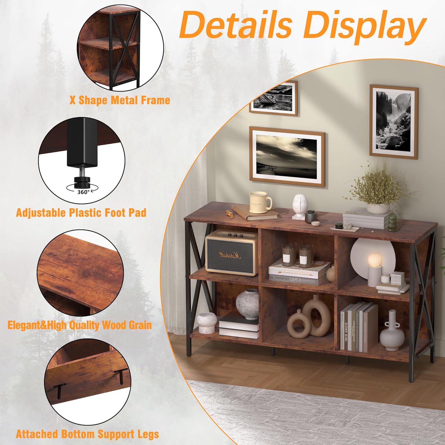 - [6-Cube Storage Organizer Wide Bookshelf] Low horizontal bookcase combination of rustic oak board and black metal frame flawlessly blends modern and traditional styles. The farmhouse-inspired design adds a charming rustic touch to your space, bring an industrial touch to your home.