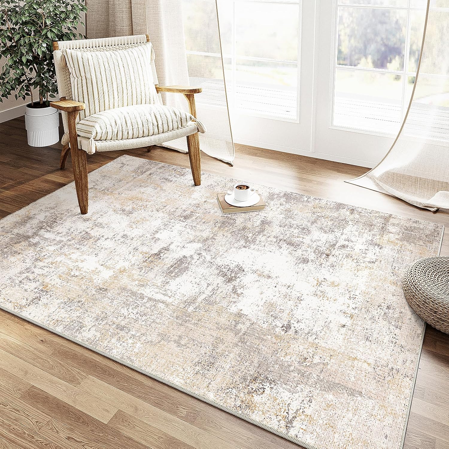 4x6 Washable Area Rug Beige Grey Neutral Abstract Entryway Kitchen Non Slip Low Pile Throw Rug Living Room Bedroom Indoor Doormat Soft Carpet for Entrance Bathroom Office