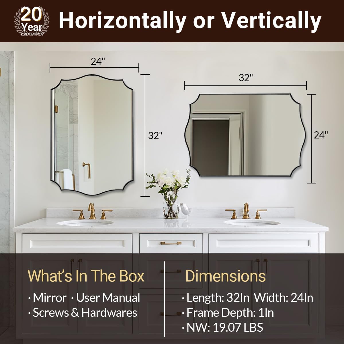 - 【Premium Stainless Steel Frame】: (N.W:19LBS). Crafted from stainless steel with oxidation-resistant properties, this unique mirror for bathroom offers enhanced stability and a longer lifespan. Shatterproof 4mm HD glass is supported by a 9mm MDF backboard (most others just 3mm ), surrounded by a 1/17" gap with a unique curved corner design to give a seamless finish