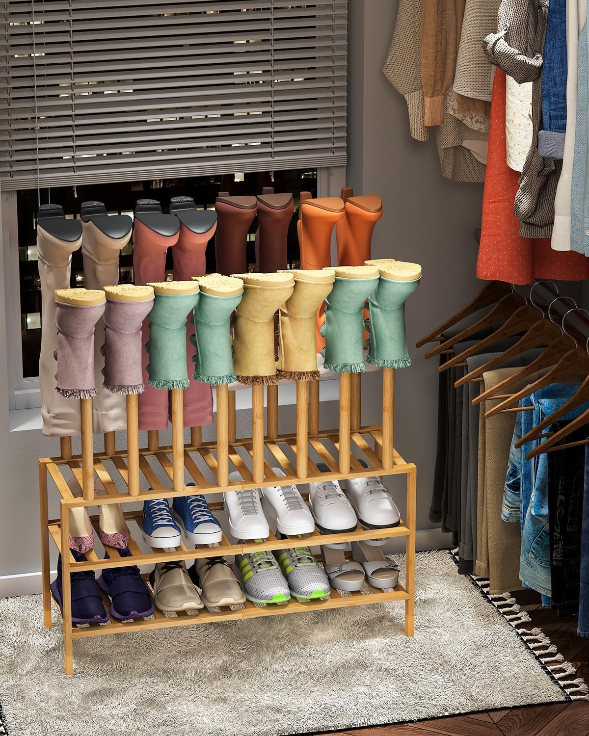 Boot Rack with Shoe Rack, Long Boot Rack Organizer Tall Boots for Closet, Bamboo Wood Shoe Shelf Storage Organizer for Entryway Small Space