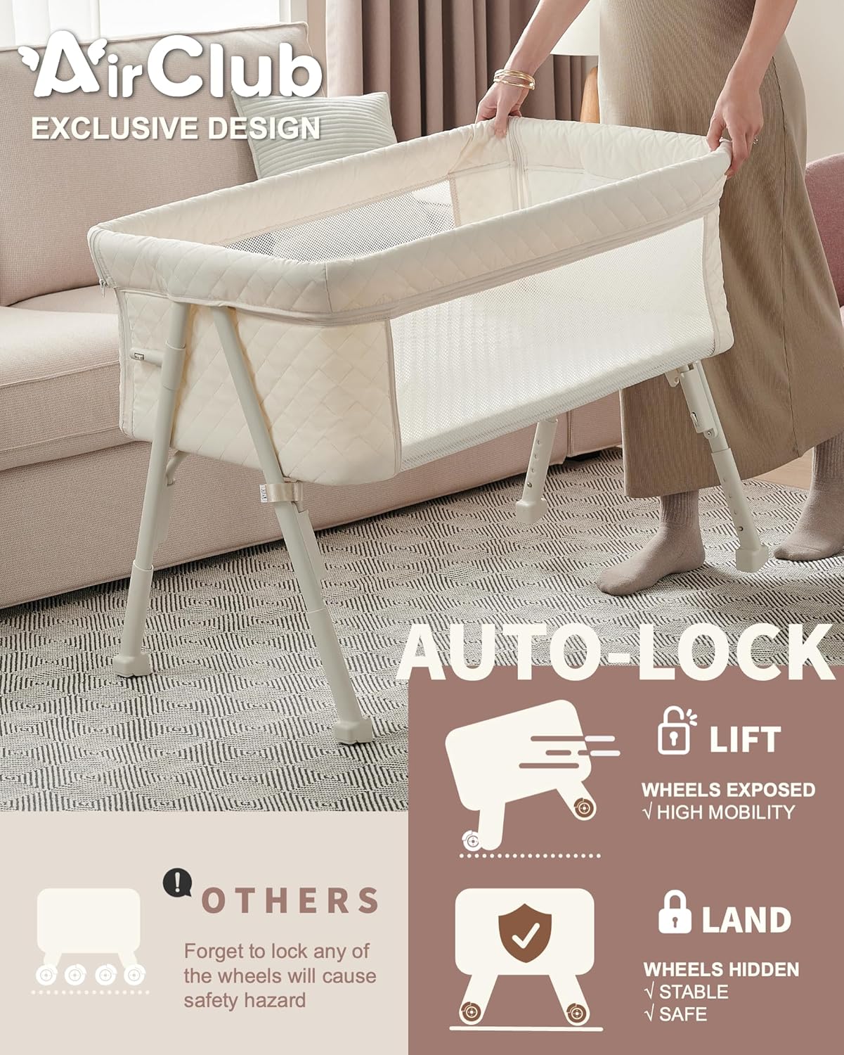 - 【EXCLUSIVE 4 AUTO-LOCK WHEELS | BRAKE-FREE & STABLE & SAFE】Compared with other products with brake wheels, AirClub bedside baby cribs equip 4 AUTO-LOCK wheels. By lifting one side, the supporting 2 feet will convert into 2 wheels, allowing smooth movement. By landing all 4 legs, the wheels will be retracted into the feet and ensure a tight grabbing on the floor. This exclusive design can avoid accidents in many situations where those wheel brakes are forgotten to lock.