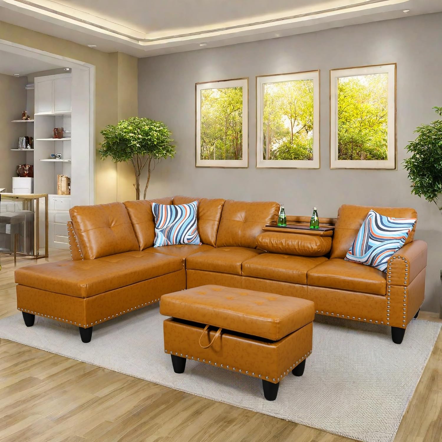L Shaped Sectional Sofa with Ottoman, Nail-Head Design Leather Right Facing Modern Couches with Cup Holder for Living Room, Bedroom, Office, Ginger