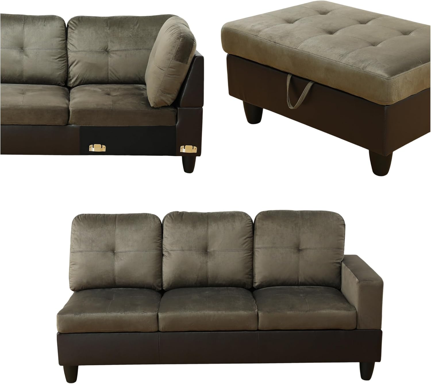 L Shaped Sectional Sofa with Ottoman, Color Blocking Flannel Leather Right Facing Modern Couches for Living Room, Bedroom, Office, Taupe