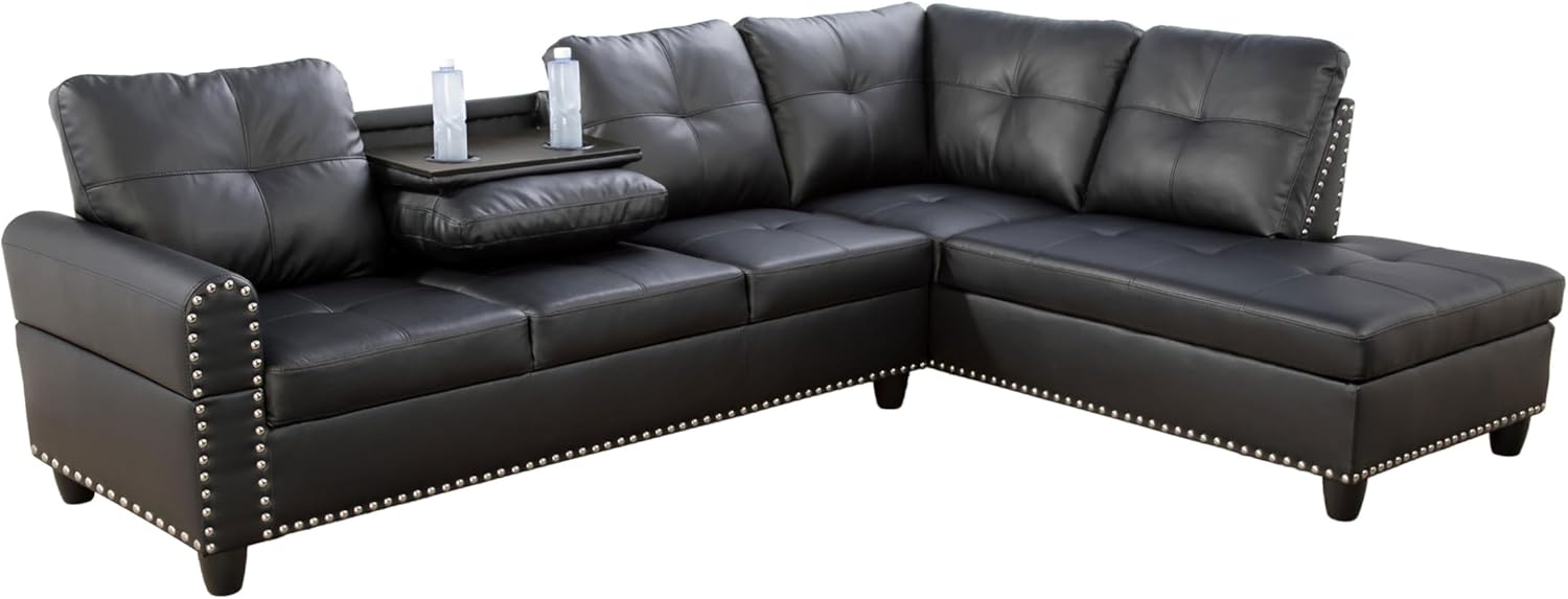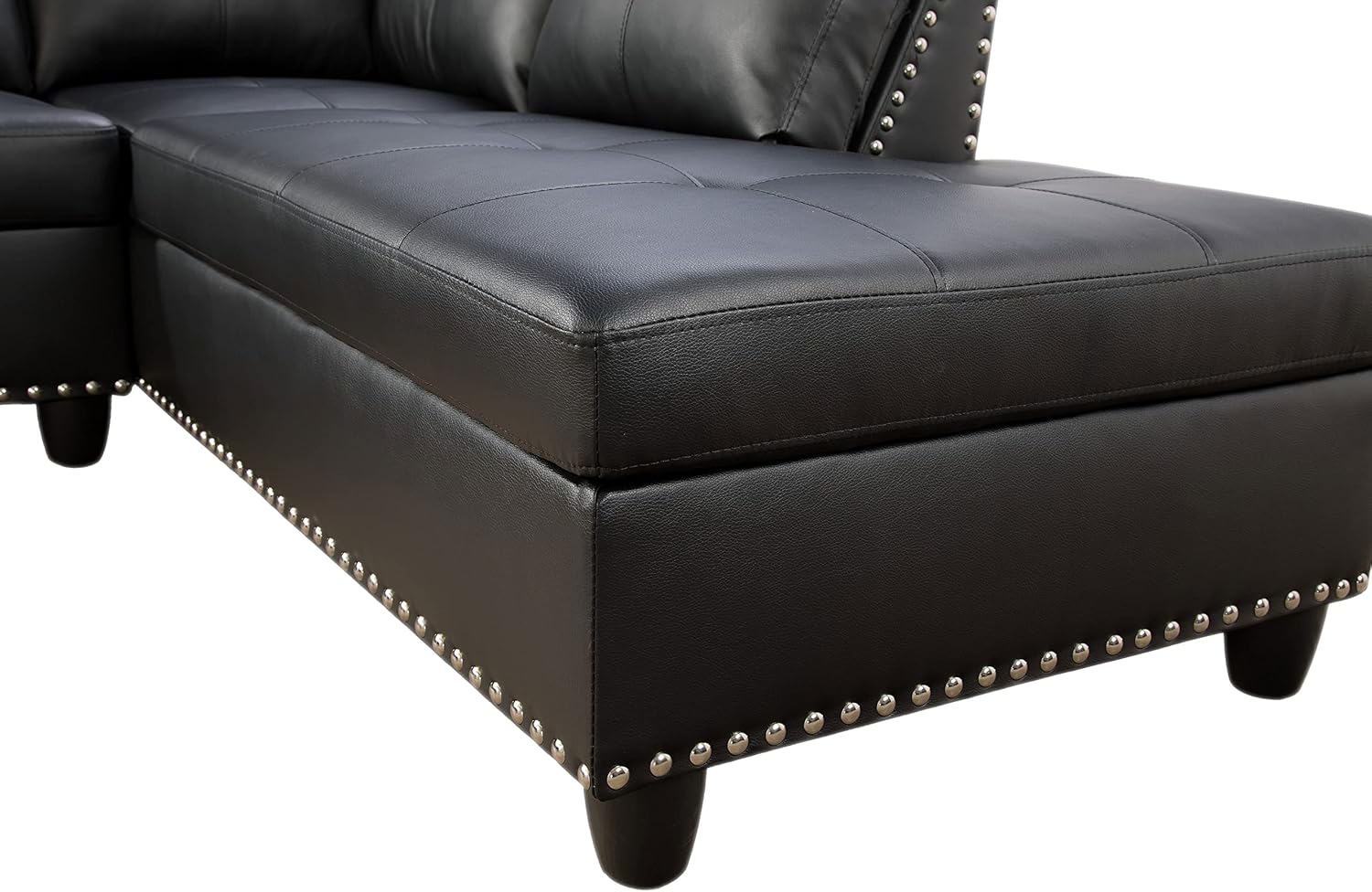 L Shaped Sectional Sofa with Ottoman, Nail-Head Design Leather Right Facing Modern Couches with Cup Holder for Living Room, Bedroom, Office, Black Leather
