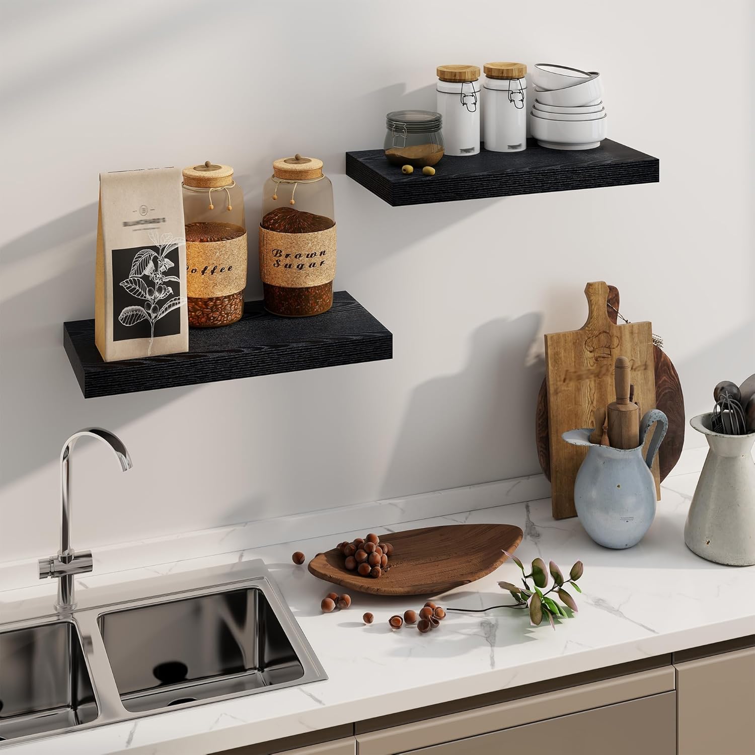Fun Memories Rustic Black Floating Shelves 24 Inch Long, 8 Inch Deep Floating Shelf, 24 x 8 Wall Shelves Set of 2, Deep Black Bathroom Shelves, 24 Long Floating Bookshelf Wall Mounted