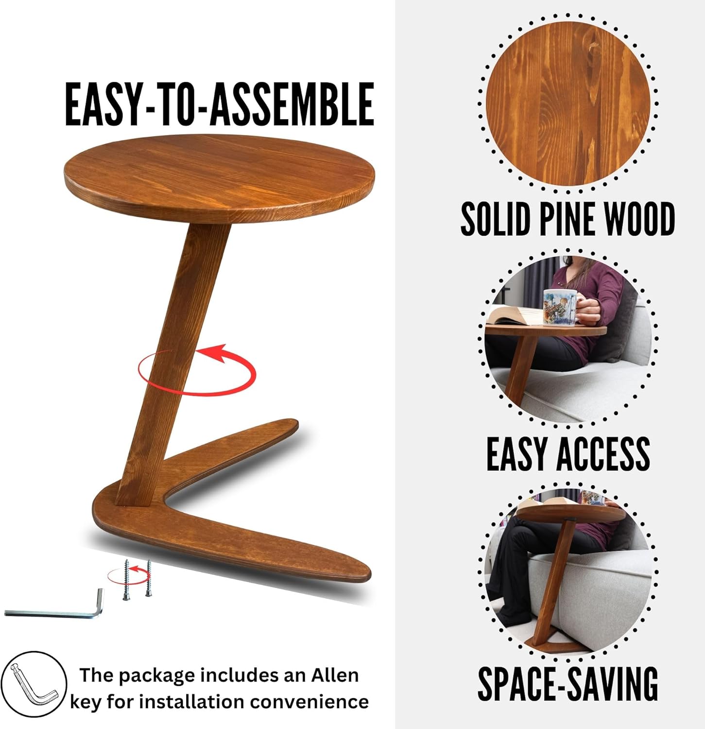 C-Shaped Handmade Solid Wood End Table, Side Table for Couches, Sofa Tables Slide Under Couch for Living Room, Over Couch TV Tray Table for Small Spaces (Medium, Chestnut)