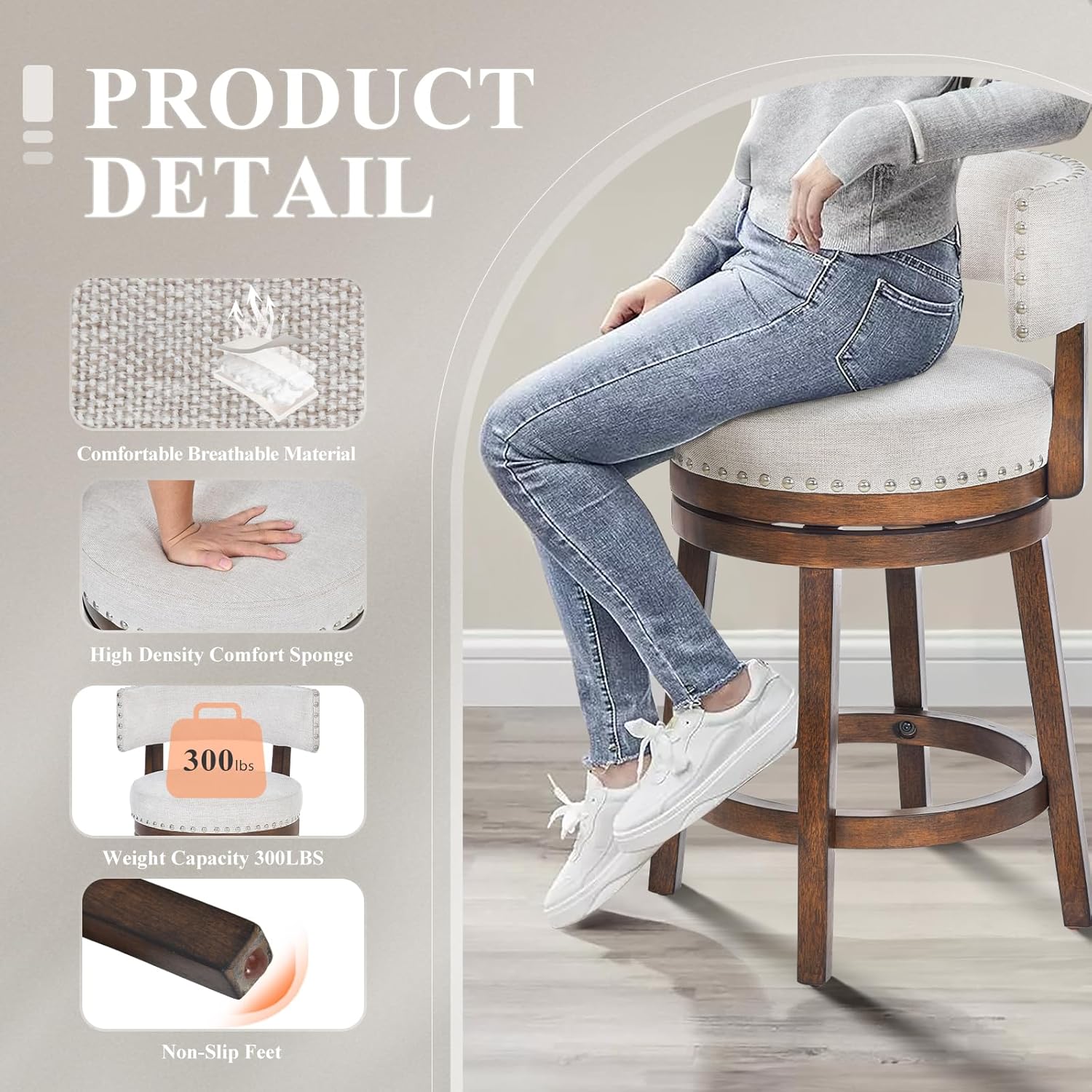 - 【360° Swivel Bar Stool】Swivel and nailhead trim all come together in this 25 inch swivel barstools, 360-degree rotation feature of this wood barstool with back offers convenience and flexibility. This makes it ideal for various settings such as bars, kitchens, or home offices. Whether you're having a conversation, working on a task, or simply enjoying a moment of relaxation, the smooth rotation allows for seamless movement and enhanced usability.
