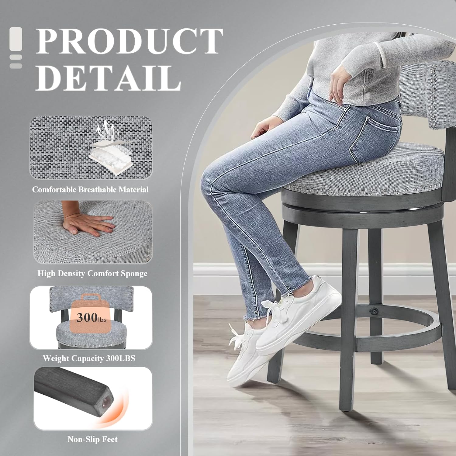 - 【360° Swivel Bar Stool】Swivel and nailhead trim all come together in this 25 inch swivel barstools, 360-degree rotation feature of this wood barstool with back offers convenience and flexibility. This makes it ideal for various settings such as bars, kitchens, or home offices. Whether you're having a conversation, working on a task, or simply enjoying a moment of relaxation, the smooth rotation allows for seamless movement and enhanced usability.