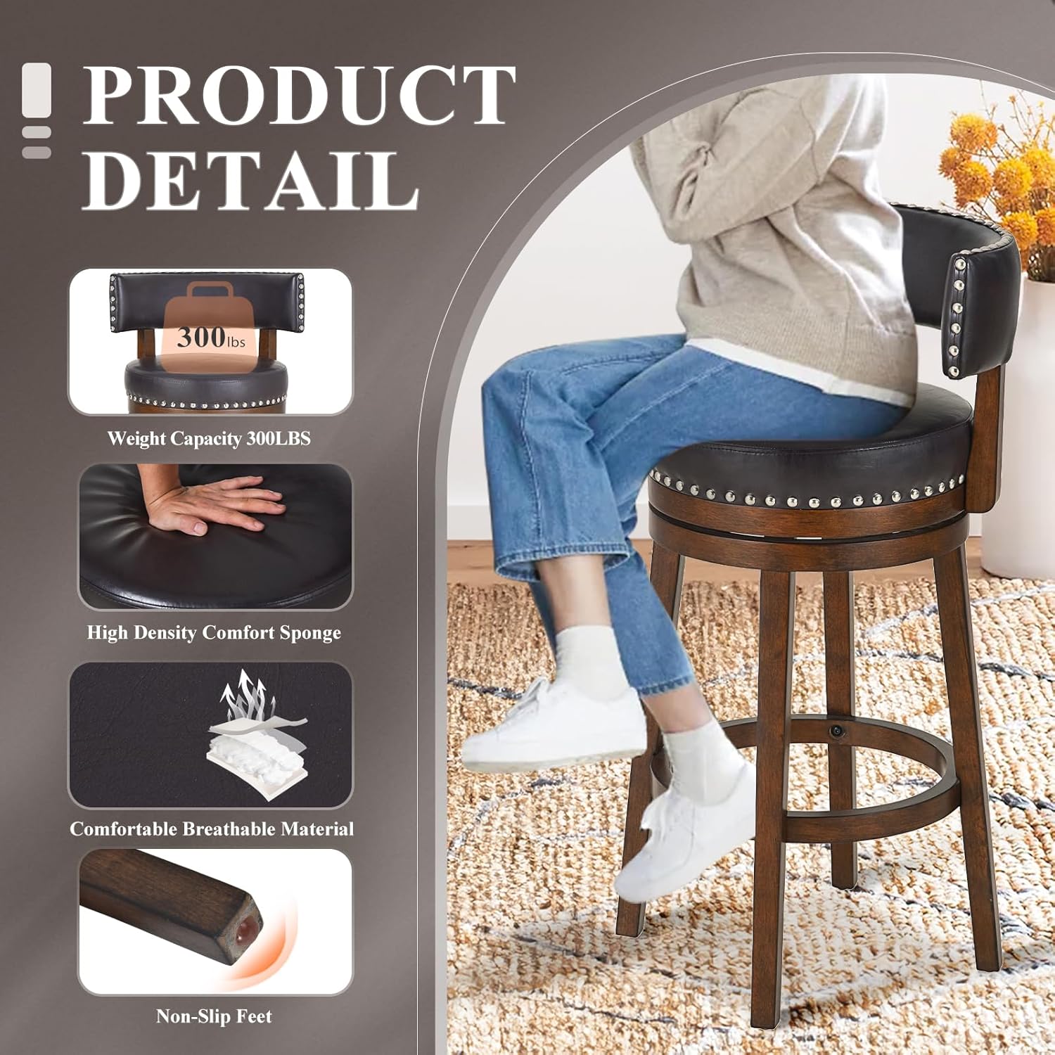 - 【360° Swivel Bar Stool】Swivel and nailhead trim all come together in this 30 inch swivel barstools, 360-degree rotation feature of this wood barstool with back offers convenience and flexibility. This makes it ideal for various settings such as bars, kitchens, or home offices. Whether you're having a conversation, working on a task, or simply enjoying a moment of relaxation, the smooth rotation allows for seamless movement and enhanced usability.