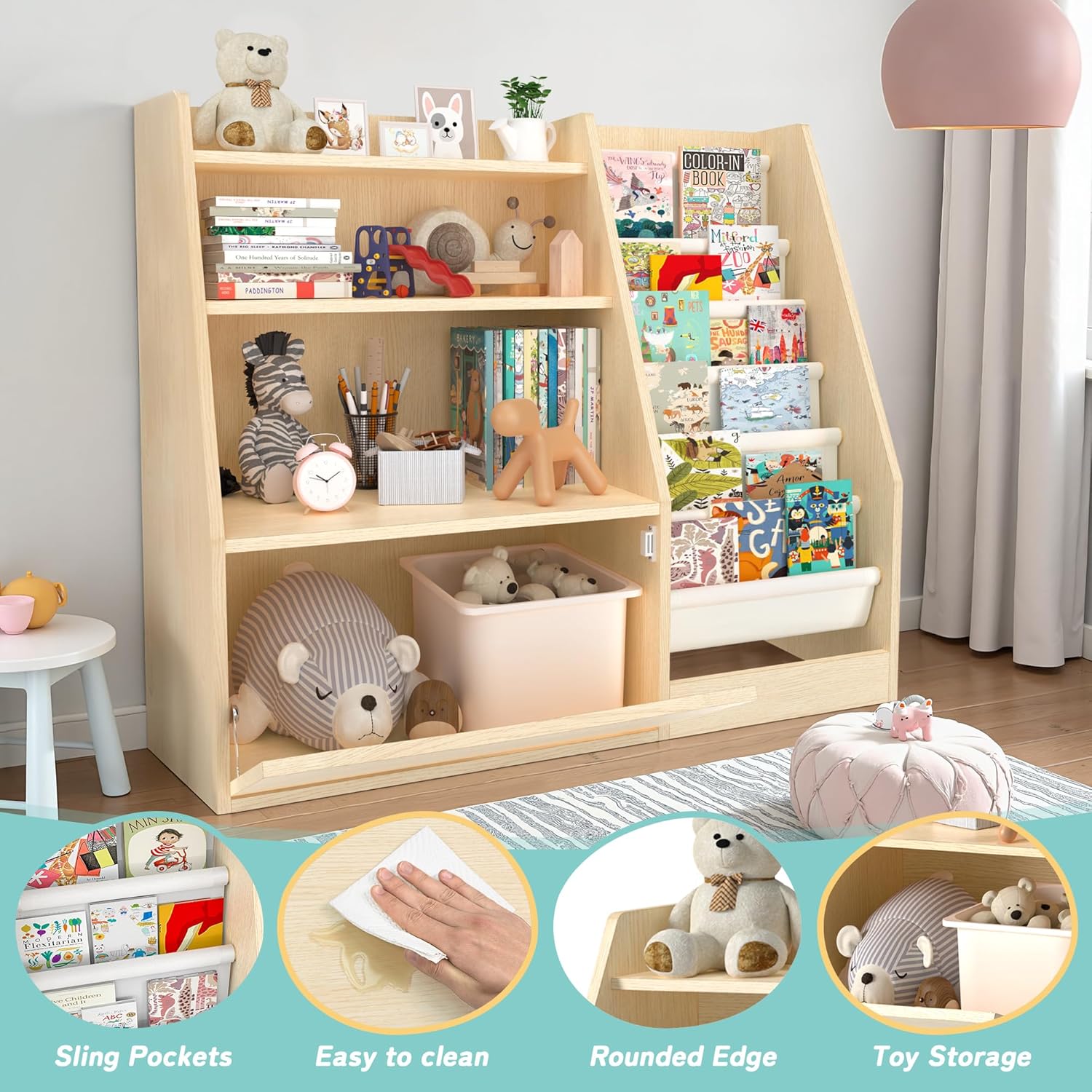 - 【Ample Storage & Organization】The kids bookshelf & book Storage Organizer includes 6 layers of sling shelves that can store reading materials,coloring books and magazines in different sizes and shapes. There is also a cabinet for book storage, which gains a large capacity of storage space. Children and toddlers can store books, pens, and other items they need