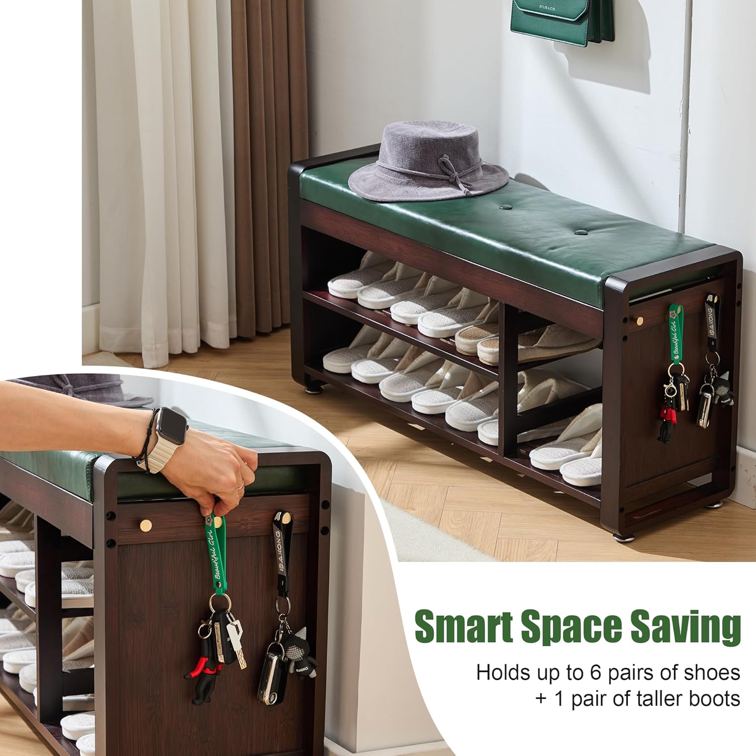 Nnewvante 37.4 inch Shoe Bench with Green Leather Cushion, 3-Tier Large Shoe Rack for Entryway Organizer, 100% Bamboo Ottoman Upholstered Bench for Hallway, Living Room, End of Bed Padded Bench